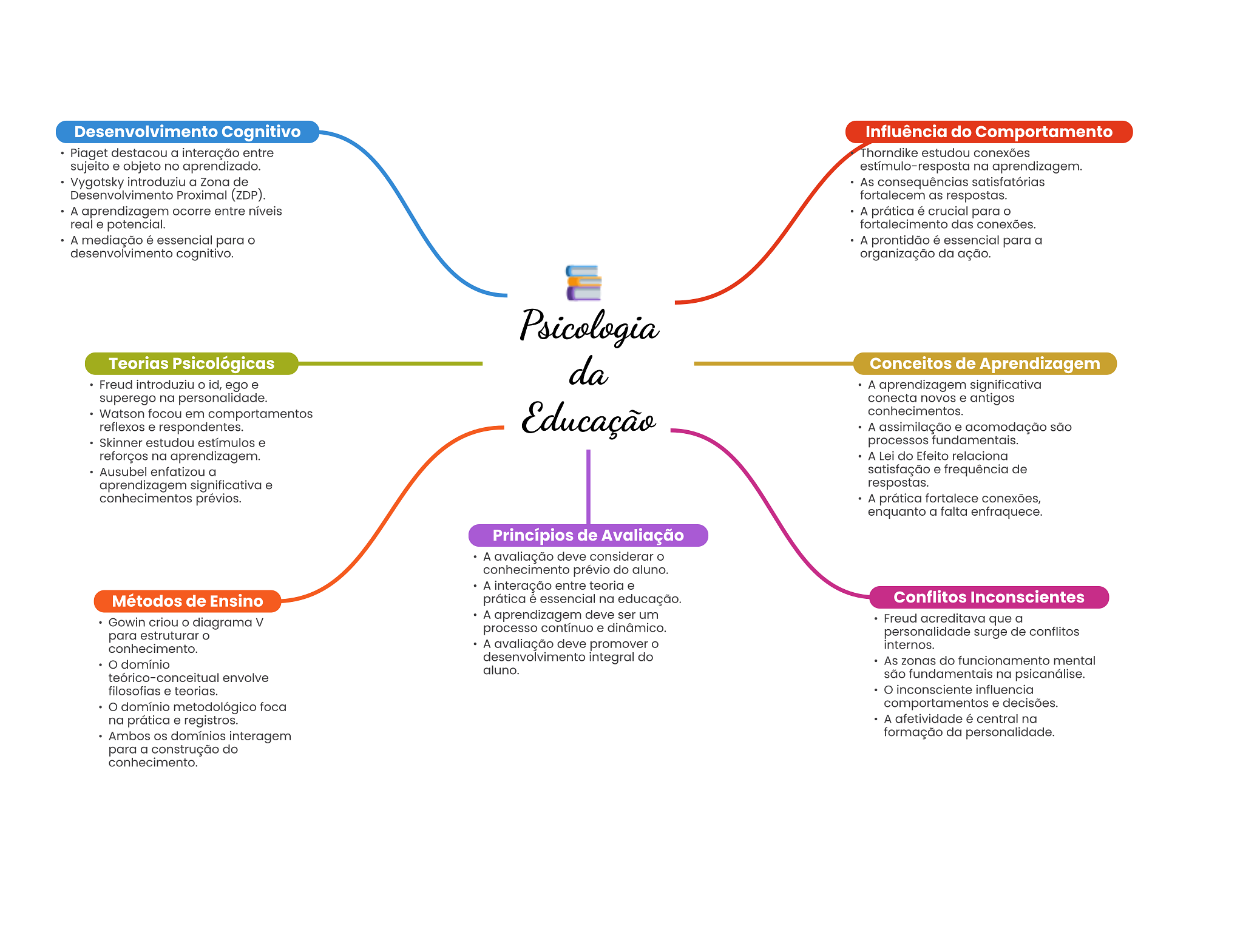 Desenvolvimento Cognitivo Influência do Comportamento Piaget destacou a interação entre Thorndike estudou conexões sujeito e objeto no aprendizado. estímulo-resposta na aprendizagem. Vygotsky introduziu a Zona de As satisfatórias Desenvolvimento Proximal (ZDP). fortalecem as respostas. A aprendizagem ocorre entre níveis A prática é crucial para real e potencial. fortalecimento das conexões. A mediação é essencial para A prontidão é essencial para a desenvolvimento cognitivo. organização da ação. Psicologia Teorias Psicológicas da Conceitos de Aprendizagem Freud introduziu id, ego e A aprendizagem significativa superego na personalidade. conecta novos e antigos Watson focou em comportamentos Educação conhecimentos. reflexos e respondentes. A assimilação e acomodação são Skinner estudou estímulos e processos fundamentais. reforços na aprendizagem. A Lei do Efeito relaciona Ausubel enfatizou a satisfação e frequência de aprendizagem significativa e respostas. conhecimentos prévios. A prática fortalece conexões, enquanto a falta enfraquece. Princípios de Avaliação A avaliação deve considerar conhecimento prévio do aluno. A interação entre teoria e Métodos de Ensino prática é essencial na educação. Conflitos Inconscientes A aprendizagem deve ser um Gowin criou diagrama V Freud acreditava que a processo contínuo e dinâmico. para estruturar personalidade surge de conflitos conhecimento. A avaliação deve promover internos. O domínio desenvolvimento integral do As zonas do funcionamento mental aluno. teórico-conceitual envolve são fundamentais na psicanálise. filosofias e teorias. inconsciente influencia domínio metodológico foca comportamentos e decisões. na prática e registros. A afetividade é central na Ambos domínios interagem formação da personalidade. para a construção do conhecimento.