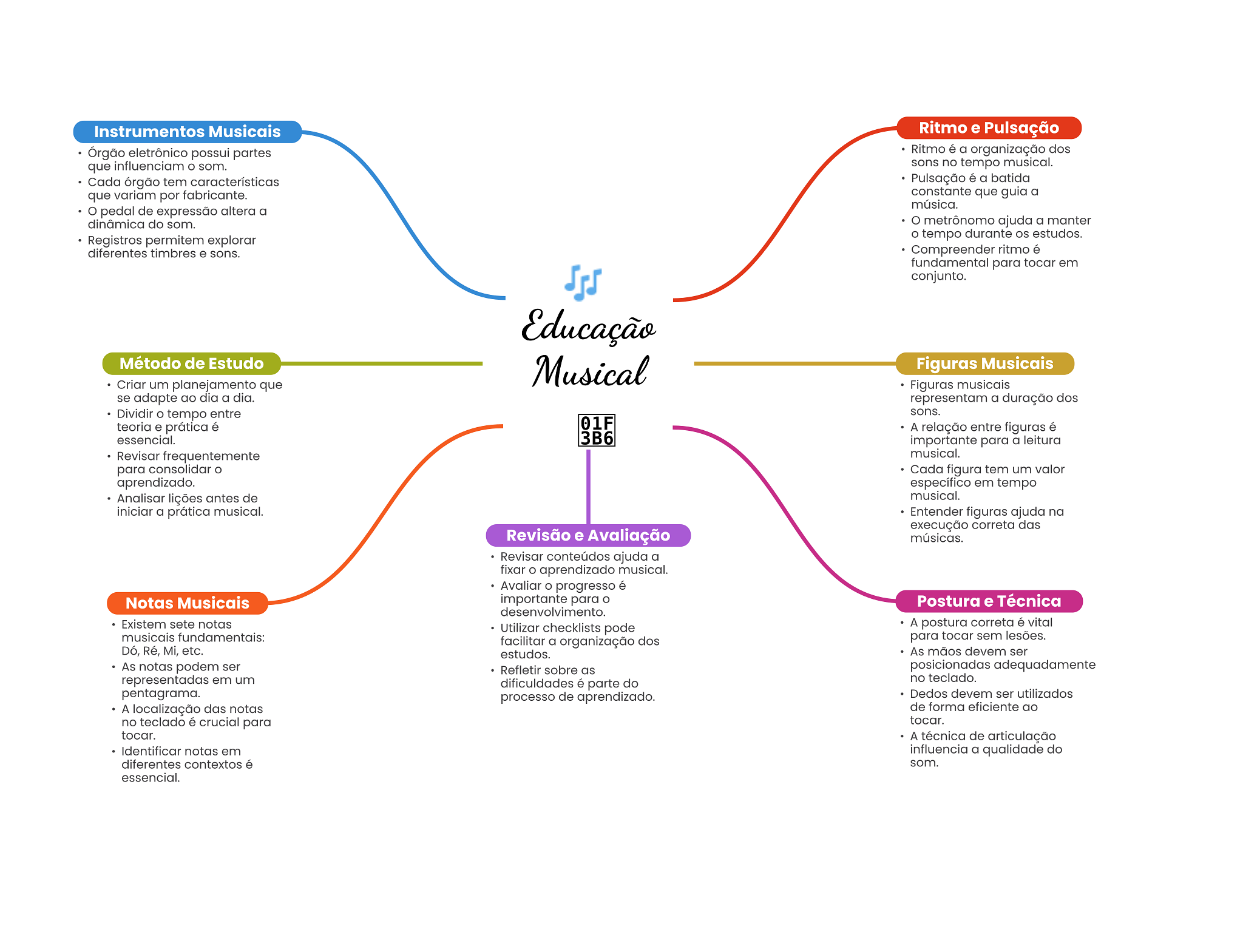 Instrumentos Musicais Ritmo e Pulsação Órgão eletrônico possui partes Ritmo é a organização dos que influenciam som. sons no tempo musical. Cada órgão tem características Pulsação é a batida que variam por fabricante. constante que guia a música. pedal de expressão altera a dinâmica do som. metrônomo ajuda a manter Registros permitem explorar O tempo durante os estudos. diferentes timbres e sons. Compreender ritmo é fundamental para tocar em conjunto. Educação Método de Estudo Musical Figuras Musicais Criar um planejamento que Figuras musicais se adapte ao dia a dia. representam a duração dos Dividir tempo entre sons. teoria e prática é 01F A relação entre figuras é essencial. 3B6 importante para a leitura Revisar frequentemente musical. para consolidar Cada figura tem um valor aprendizado. específico em tempo Analisar lições antes de musical. iniciar a prática musical. Entender figuras ajuda na execução correta das Revisão e Avaliação músicas. Revisar conteúdos ajuda a fixar aprendizado musical. Avaliar progresso é Notas Musicais importante para Postura e Técnica desenvolvimento. Existem sete notas Utilizar checklists pode A postura correta é vital musicais fundamentais: facilitar a organização dos para tocar sem lesões. Dó, Ré, Mi, etc. estudos. As mãos devem ser As notas podem ser Refletir sobre as posicionadas adequadamente representadas em um no teclado. dificuldades é parte do pentagrama. processo de aprendizado. Dedos devem ser utilizados A localização das notas de forma eficiente ao no teclado é crucial para tocar. tocar. A técnica de Identificar notas em influencia a qualidade do diferentes contextos é som. essencial.