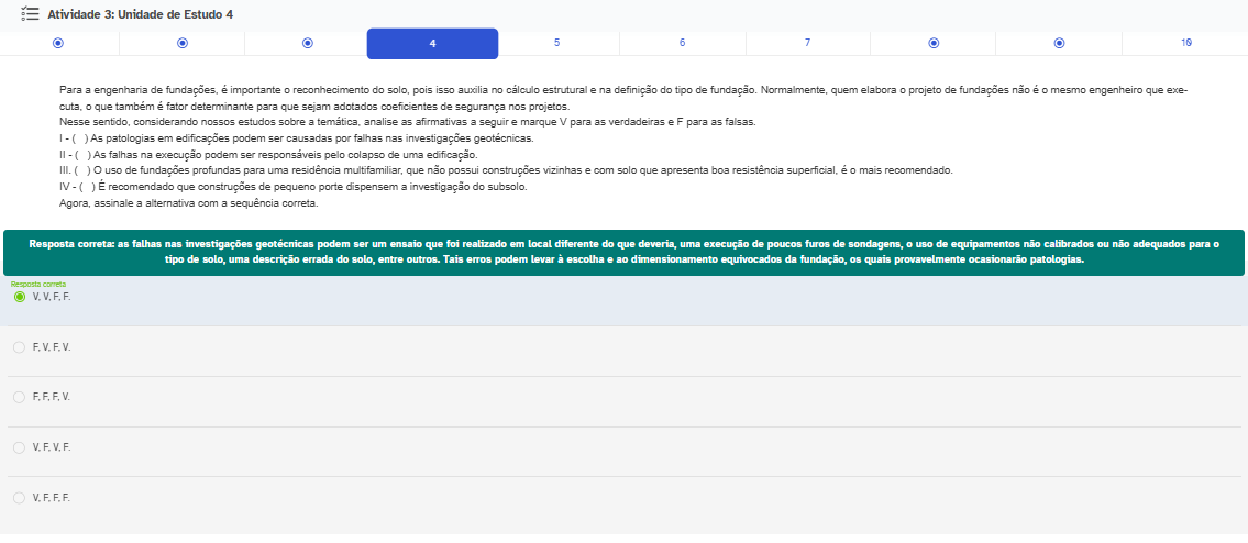 Atividade 3: Unidade de Estudo 4 4 5 6 7 10 Para a engenharia de fundações, é importante reconhecimento do solo, pois isso auxilia no cálculo estrutural e na definição do tipo de fundação. quem elabora projeto de fundações não é mesmo engenheiro que exe- cuta, que também é fator determinante para que sejam adotados coeficientes de segurança nos projetos. Nesse sentido, considerando nossos estudos sobre a analise as afirmativas a seguir e marque V para as verdadeiras para as As patologias em edificações podem ser causadas por falhas nas investigações II As falhas na execução podem ser responsáveis pelo colapso de uma edificação. III. uso de fundações profundas para uma multifamiliar, que não possui construções vizinhas e com solo que apresenta boa resistência superficial, é mais recomendado IV É recomendado que construções de pequeno porte dispensem a investigação do assinale a alternativa com a Resposta correta: as falhas nas investigações geotécnicas podem ser um ensaio que foi realizado em local diferente do que deveria, uma execução de poucos furos de sondagens, uso de equipamentos não calibrados ou não adequados para tipo de solo, uma descrição errada do solo, entre outros. Tais erros podem levar à escolha ao dimensionamento equivocados da fundação, os quais provavelmente ocasionarão patologias. Resposta correta V.V.F.F. F.V.F.V. F.F.F.V. V.F.V.F. V.F.F.F.