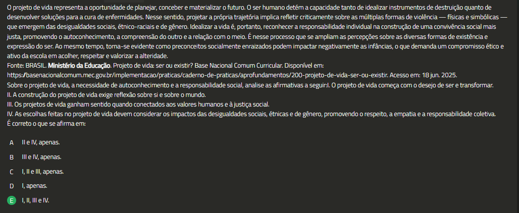 projeto de vida representa a oportunidade de planejar, conceber e materializar 0 futuro. 0 ser humano detém a capacidade tanto de idealizar instrumentos de destruição quanto de desenvolver soluções para a cura de enfermidades. Nesse sentido, projetar a implica refletir criticamente sobre as múltiplas formas de violência e simbólicas que emergem das desigualdades sociais, étnico-raciais e de gênero. Idealizar a vida é, portanto, reconhecer a responsabilidade individual na construção de uma convivência social mais justa, promovendo autoconhecimento, a compreensão do outro e a relação com 0 meio. É nesse processo que se ampliam as percepções sobre as diversas formas de existência e expressão do ser. Ao mesmo tempo, torna-se evidente como preconceitos socialmente enraizados podem impactar negativamente as infâncias, 0 que demanda um compromisso ético e ativo da escola em acolher, respeitar e valorizar a alteridade. Fonte: BRASIL. Ministério da Educação. Projeto de vida: ser ou existir? Base Nacional Comum Curricular. Disponível em: https:/basenacionalcomun.mec.govbr/implementacao/praticas/caderno-de-praticas/aprofundamentos/200-projeto-de-vida-ser-ou-existi.Acessoem 18 jun. 2025. Sobre projeto de vida, a necessidade de autoconhecimento e a responsabilidade social, analise as afirmativas a seguir:l. 0 projeto de vida começa com desejo de ser e transformar. II. A construção do projeto de vida exige reflexão sobre si e sobre 0 mundo. III. Os projetos de vida ganham sentido quando conectados aos valores humanos e à justiça social. IV. As escolhas feitas no projeto de vida devem considerar impactos das desigualdades sociais, étnicas e de gênero, promovendo 0 respeito, a empatia e a responsabilidade coletiva. É correto que se afirma em: A II e IV, apenas. III e IV, apenas. C I, II e III, apenas. D I, apenas. E I, II, III IV.