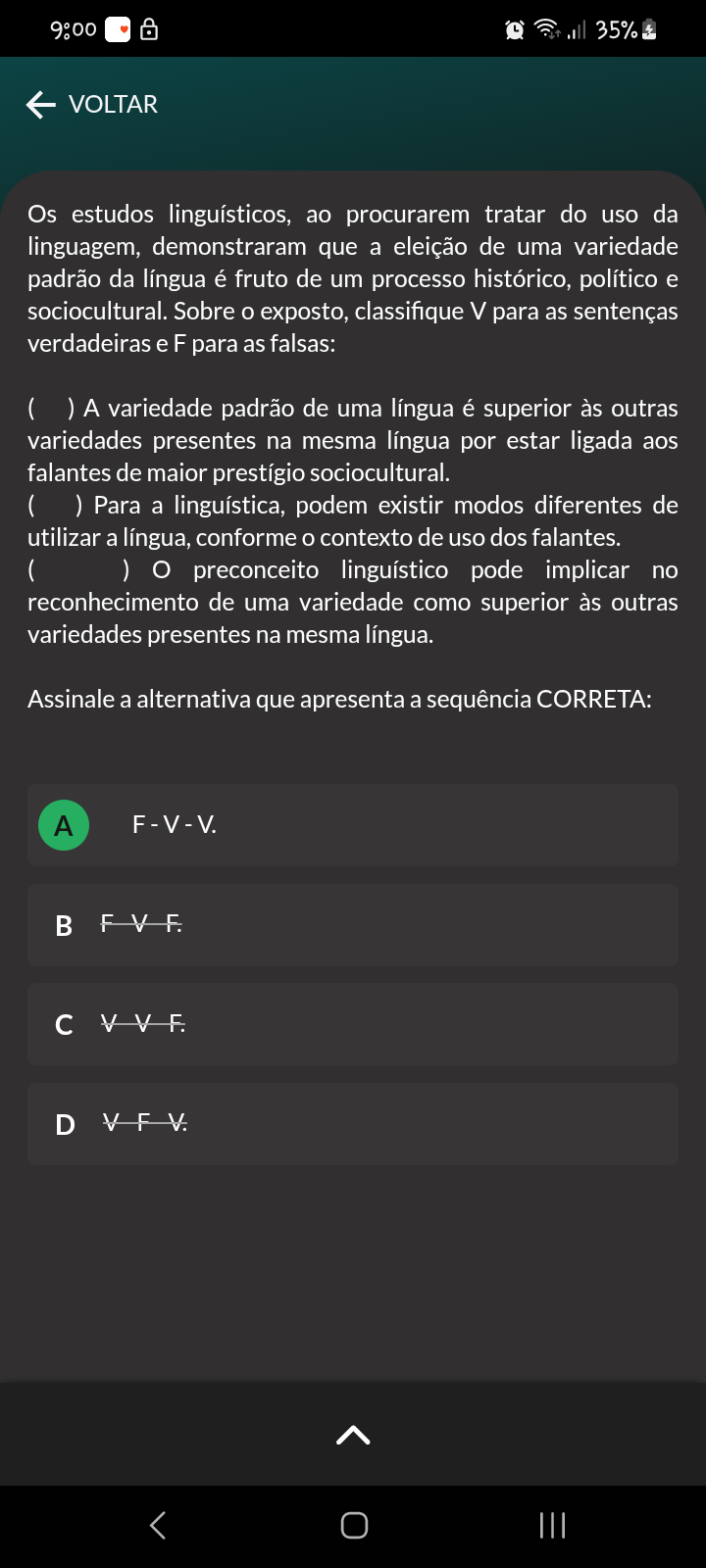 9:00 35% VOLTAR Os estudos linguísticos, ao procurarem tratar do uso da linguagem, demonstraram que a eleição de uma variedade padrão da língua é fruto de um processo histórico, político e sociocultural. Sobre o exposto, classifique V para as sentenças verdadeiras e F para as falsas: ( ) A variedade padrão de uma língua é superior às outras variedades presentes na mesma língua por estar ligada aos falantes de maior prestígio sociocultural. ( ) Para a linguística, podem existir modos diferentes de utilizar a língua, conforme o contexto de uso dos falantes. ( ) preconceito linguístico pode implicar no reconhecimento de uma variedade como superior às outras variedades presentes na mesma língua. Assinale a alternativa que apresenta a sequência CORRETA: A c V V F. D