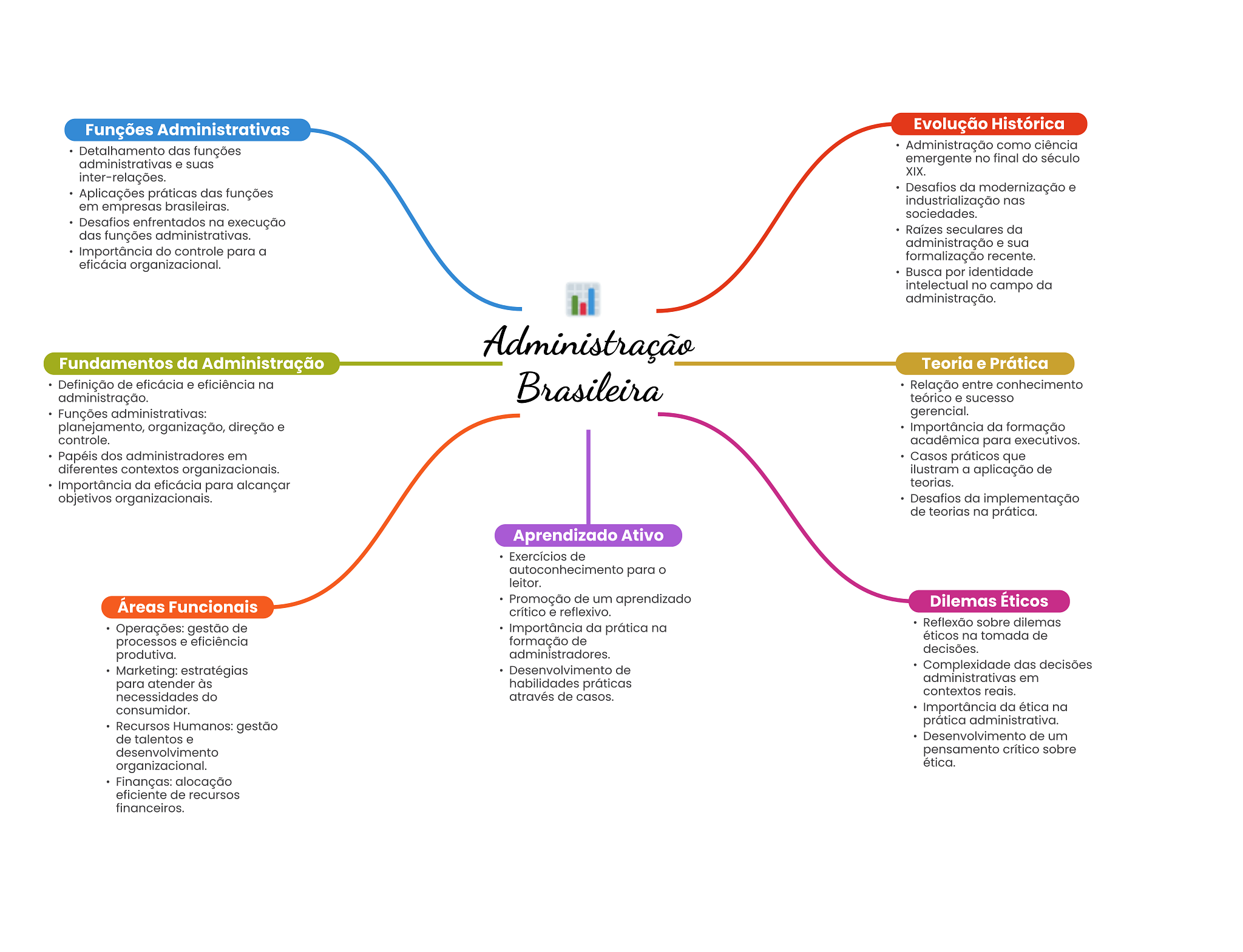 Funções Administrativas Evolução Histórica Detalhamento das funções Administração como ciência administrativas e suas emergente no final do século XIX. inter-relações. Aplicações práticas das funções Desafios da modernização e em empresas brasileiras. industrialização nas sociedades. Desafios enfrentados na execução Raízes seculares da das funções administrativas. administração e sua Importância do controle para a formalização recente. eficácia organizacional. Busca por identidade intelectual no campo da administração. Administração Fundamentos da Administração Teoria e Prática Definição de eficácia e eficiência na administração. Brasileira Relação entre conhecimento teórico e sucesso Funções administrativas: gerencial. planejamento, organização, direção e Importância da formação controle. acadêmica para executivos. Papéis dos administradores em Casos práticos que diferentes contextos organizacionais. ilustram a aplicação de Importância da eficácia para alcançar teorias. objetivos organizacionais. Desafios da implementação de teorias na prática. Aprendizado Ativo Exercícios de autoconhecimento para leitor. Áreas Funcionais Promoção de um aprendizado Dilemas Éticos crítico e reflexivo. Reflexão sobre dilemas Operações: gestão de Importância da prática na éticos na tomada de processos e eficiência formação de produtiva. administradores. decisões. Marketing: estratégias Desenvolvimento de Complexidade das decisões administrativas em para atender às habilidades práticas necessidades do através de casos. contextos reais. consumidor. Importância da ética na Recursos Humanos: gestão prática administrativa. de talentos e Desenvolvimento de um desenvolvimento pensamento crítico sobre organizacional. ética. Finanças: alocação eficiente de recursos financeiros.