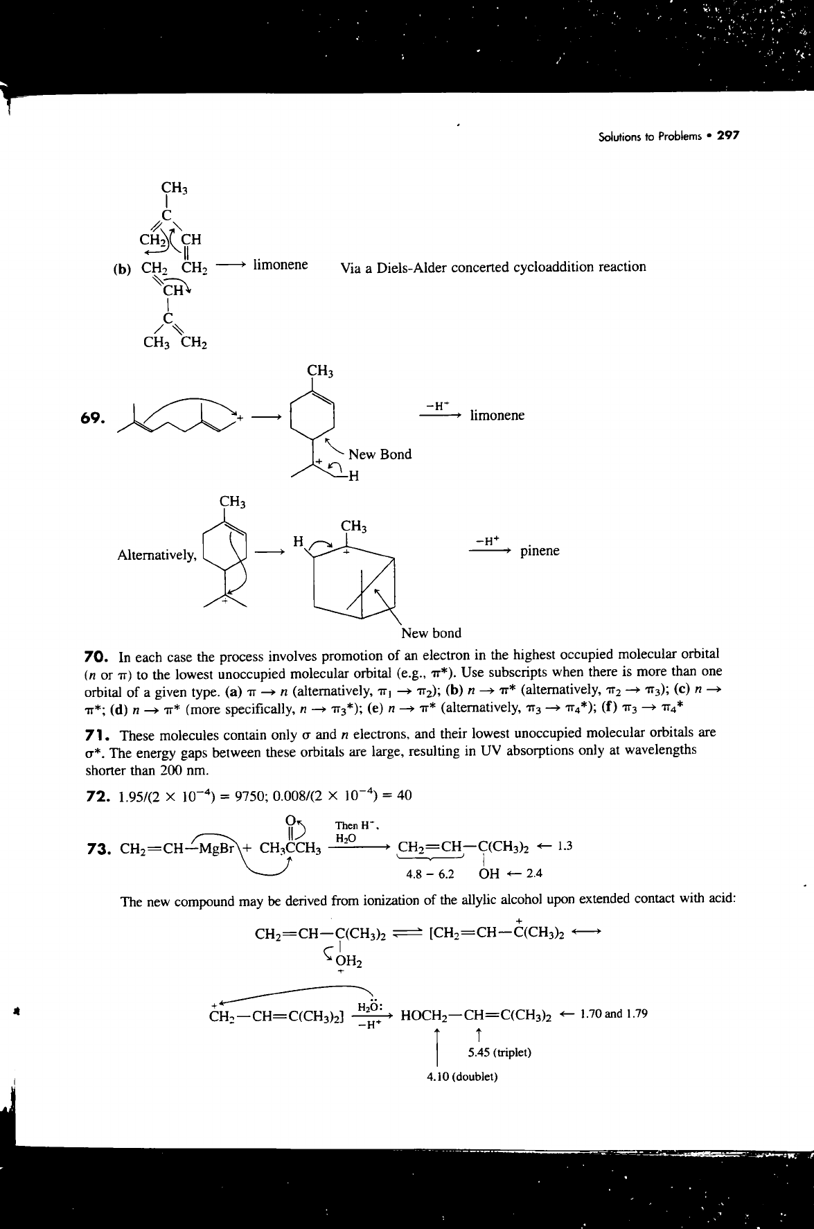 Solutions to Problems 297 CH₃ C CH₂ CH (b) CH₂ CH₂ limonene Via a Diels-Alder concerted cycloaddition reaction CH C CH₃ CH₂ CH₃ 69. + limonene New Bond + H CH₃ CH₃ H Alternatively, + -H+ pinene New bond 70. In each case the process involves promotion of an electron in the highest occupied molecular orbital (n or π) to the lowest unoccupied molecular orbital (e.g., π*). Use subscripts when there is more than one orbital of a given type. (a) TT n (alternatively, (b) n π* (alternatively, π₂ π₃); (c) n π*; (d) n π* (more specifically, n π₃*); (e) n (alternatively, (f) π₃ 71. These molecules contain only σ and n electrons, and their lowest unoccupied molecular orbitals are σ*. The energy gaps between these orbitals are large, resulting in UV absorptions only at wavelengths shorter than 200 nm. 72. 1.95/(2 X 10⁻⁴) = 9750; 0.008/(2 X 10⁻⁴) = 40 Then 73. + CH₃CCH₃ 1.3 4.8 - 6.2 OH 2.4 The new compound may be derived from ionization of the allylic alcohol upon extended contact with acid: + OH₂ + + H2O: 1.70 and 1.79 5.45 (triplet) 4.10 (doublet)