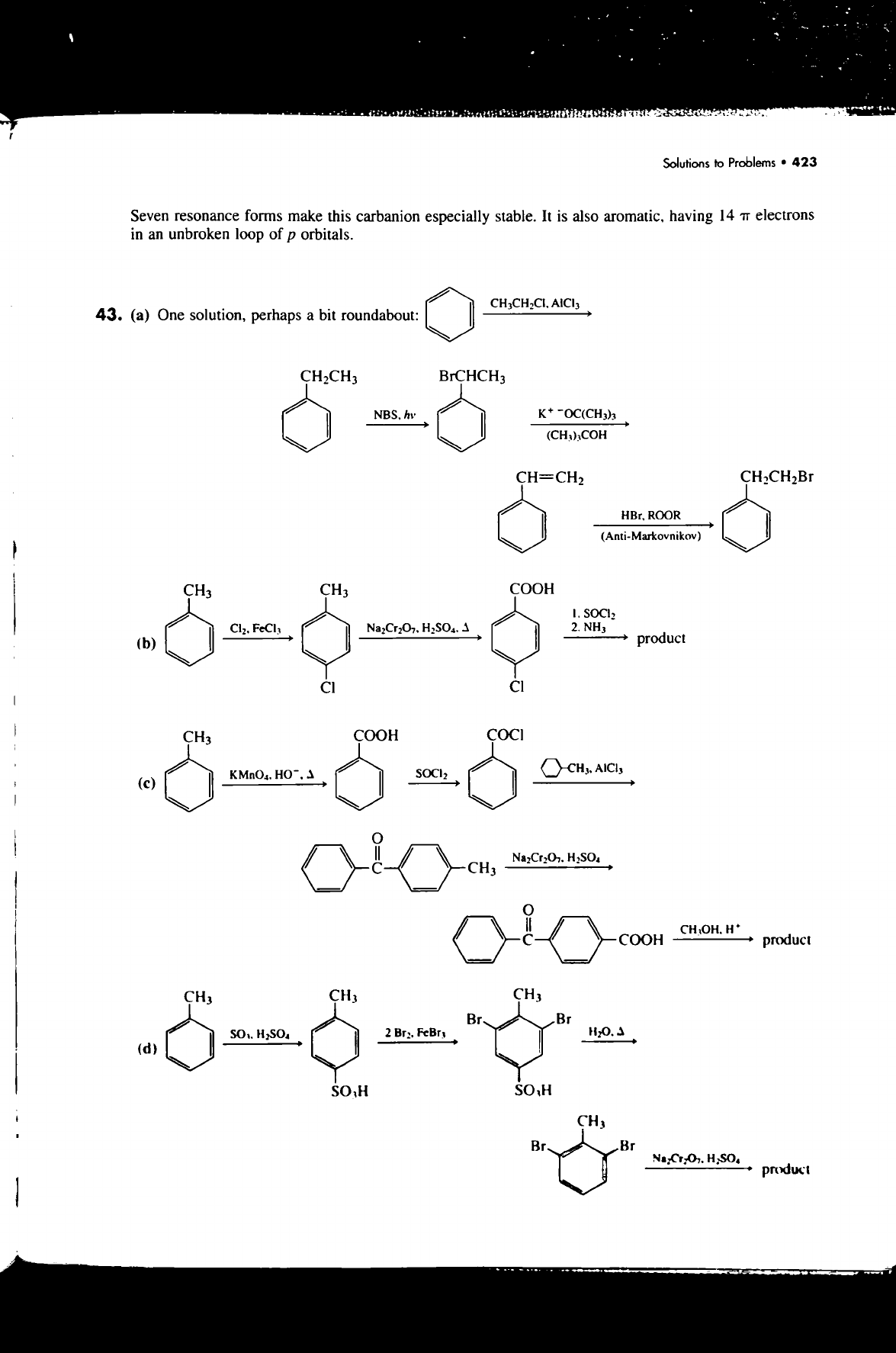 Solutions to Problems . 423 Seven resonance forms make this carbanion especially stable. It is also aromatic, having 14 electrons in an unbroken loop of p orbitals. 43. (a) One solution, perhaps a bit roundabout: CH₂CH₃ BrCHCH₃ NBS, hv CH=CH₂ CH₂CH₂Br HBr, ROOR (Anti-Markovnikov) CH₃ CH₃ COOH I. FeCl₃ 1 2. NH3 (b) product CI CH₃ COOH COCI KMnO₄. 1 (c) O C CH₃ II C COOH product CH₃ CH₃ Br Br H2SO4 2 1 (d) CH₃ Br Br product
