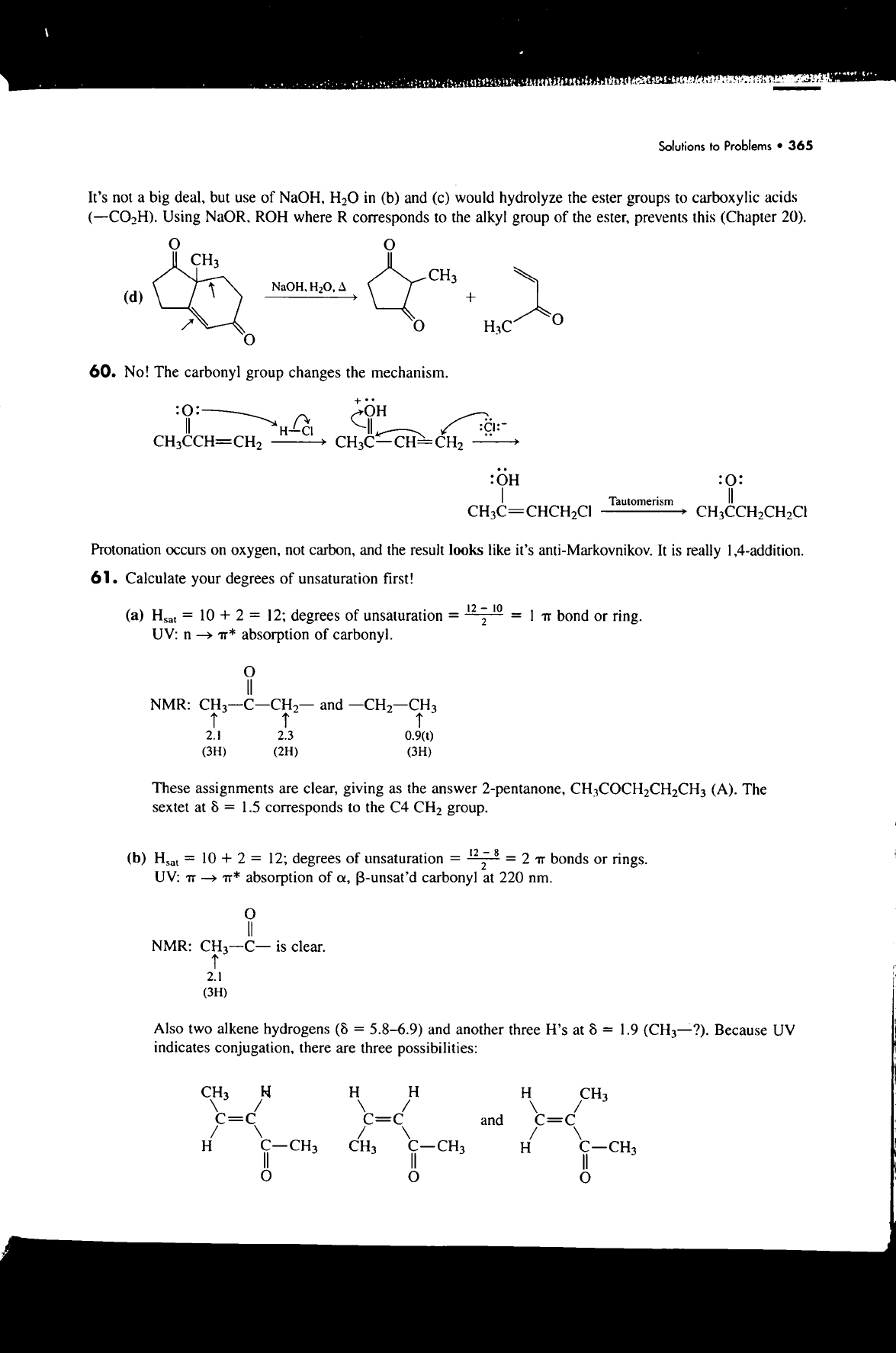 Solutions to Problems 365 It's not a big deal, but use of NaOH, H₂O in (b) and (c) would hydrolyze the ester groups to carboxylic acids (-CO₂H). Using ROH where R corresponds to the alkyl group of the ester, prevents this (Chapter 20). CH₃ CH₃ (d) + 0 0 H₃C 0 60. No! The carbonyl group changes the mechanism. + :OH :0: Tautomerism CH₃CCH₂CH₂Cl Protonation occurs on oxygen, not carbon, and the result looks like it's anti-Markovnikov. It is really 1,4-addition. 61. Calculate your degrees of unsaturation first! (a) = = 12; degrees of unsaturation = 12 2 10 = 1 TT bond or ring. UV: n absorption of carbonyl. NMR: 2.1 2.3 0.9(t) (3H) (2H) (3H) These assignments are clear, giving as the answer 2-pentanone, (A). The sextet at δ = 1.5 corresponds to the C4 CH₂ group. (b) = 10 + 2 = 12; degrees of unsaturation = 12 2 8 = 2 TT bonds or rings. UV: TT π* absorption of α, ß-unsat'd carbonyl at 220 nm. O NMR: is clear. 2.1 (3H) Also two alkene hydrogens (δ = 5.8-6.9) and another three H's at δ = 1.9 Because UV indicates conjugation, there are three possibilities: CH₃ H H H H CH₃ C = C and C C H C CH₃ CH₃ C CH₃ H C CH₃ O
