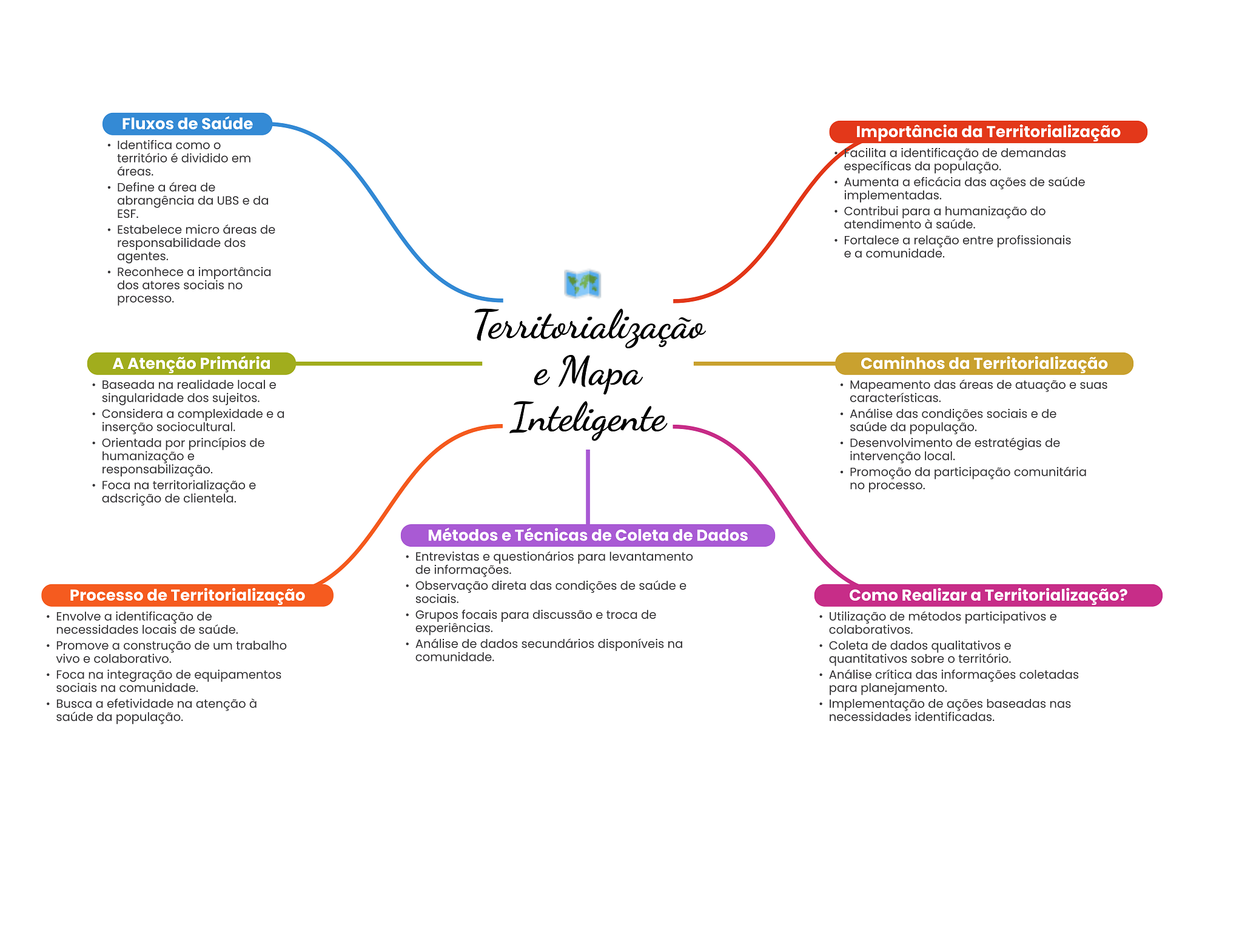 Fluxos de Saúde Importância da Territorialização Identifica como território é dividido em Facilita a identificação de demandas áreas. específicas da população. Define a área de Aumenta a eficácia das ações de saúde abrangência da UBS e da implementadas. ESF. Contribui para a humanização do Estabelece micro áreas de atendimento à saúde. responsabilidade dos Fortalece a relação entre profissionais agentes. e a comunidade. Reconhece a importância dos atores sociais no processo. Territorialização A Atenção Primária Baseada na realidade local e e Caminhos da Territorialização Mapeamento das áreas de atuação e suas singularidade dos sujeitos. características. Considera a complexidade e a inserção sociocultural. Inteligente Análise das condições sociais e de saúde da população. Orientada por princípios de Desenvolvimento de estratégias de humanização e intervenção local. responsabilização. Promoção da participação comunitária Foca na territorialização e no processo. adscrição de clientela. Métodos e Técnicas de Coleta de Dados Entrevistas e questionários para levantamento de informações. Observação direta das condições de saúde e Processo de Territorialização sociais. Como Realizar a Territorialização? Envolve a identificação de Grupos focais para discussão e troca de Utilização de métodos participativos e necessidades locais de saúde. experiências. colaborativos. Promove a construção de um trabalho Análise de dados secundários disponíveis na Coleta de dados qualitativos e vivo e colaborativo. comunidade. quantitativos sobre território. Foca na integração de equipamentos Análise crítica das informações coletadas sociais na comunidade. para planejamento. Busca a efetividade na atenção à Implementação de ações baseadas nas saúde da população. necessidades identificadas.