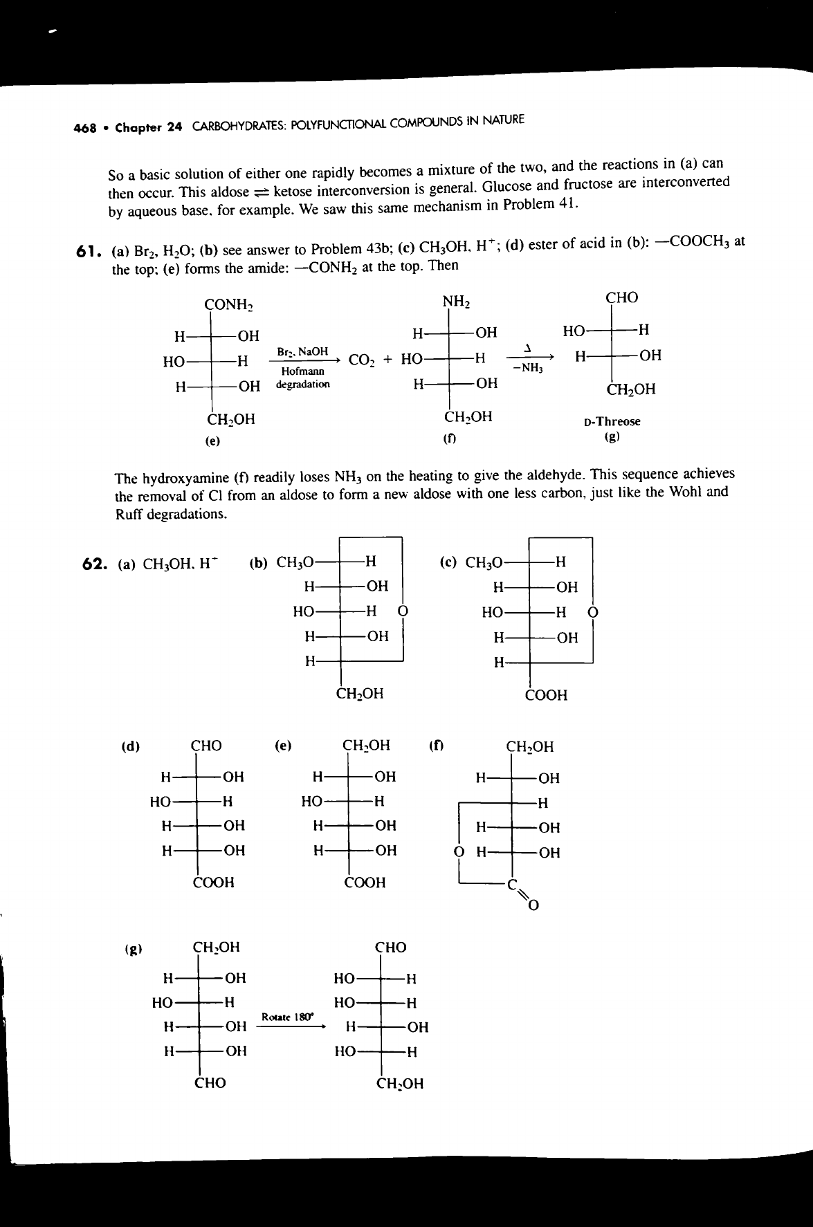468 Chapter 24 CARBOHYDRATES: POLYFUNCTIONAL COMPOUNDS IN NATURE So a basic solution of either one rapidly becomes a mixture of the two, and the reactions in (a) can then occur. This aldose ketose interconversion is general. Glucose and fructose are interconverted by aqueous base. for example. We saw this same mechanism in Problem 41. 61. (a) Br₂, H₂O; (b) see answer to Problem 43b; (c) CH₃OH, (d) ester of acid in (b): at the top: (e) forms the amide: -CONH₂ at the top. Then CONH₂ NH₂ CHO H OH H OH H Br₂. NaOH 1 H CO₂ + HO H H OH Hofmann -NH₃ H OH degradation H OH CH₂OH CH₂OH CH₂OH D-Threose (e) (f) (g) The hydroxyamine (f) readily loses on the heating to give the aldehyde. This sequence achieves the removal of from an aldose to form a new aldose with one less carbon, just like the Wohl and Ruff degradations. 62. (a) (b) H (c) H H OH H OH HO H HO H O H OH H OH H H CH₂OH COOH (d) CHO (e) CH₂OH (f) CH₂OH H OH H OH H OH HO H HO H H H OH H OH H OH H OH H OH H OH COOH COOH C (g) CH₂OH CHO H OH H H HO H Rotate H OH H OH H OH HO H CHO CH₂OH
