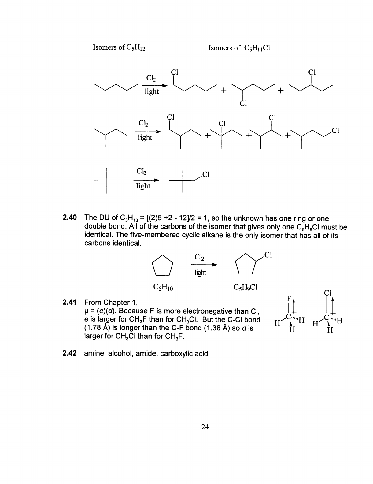 Isomers of C₅H₁₂ Isomers of C₅H₁₁Cl Cl Cl light + + Cl Cl Cl Cl₂ Cl Cl light + + + Cl light 2.40 The DU of C₅H₁₀ = [(2)5 +2 - 12]/2 = 1, so the unknown has one ring or one double bond. All of the carbons of the isomer that gives only one must be identical. The five-membered cyclic alkane is the only isomer that has all of its carbons identical. Cl light C₅H₁₀ C₅H₉Cl F 2.41 From Chapter 1, = (e)(d). Because F is more electronegative than CI, e is larger for CH₃F than for But the C-CI bond C H C H (1.78 Å) is longer than the C-F bond (1.38 Å) so d is H H H H larger for CH₃CI than for 2.42 amine, alcohol, amide, carboxylic acid 24