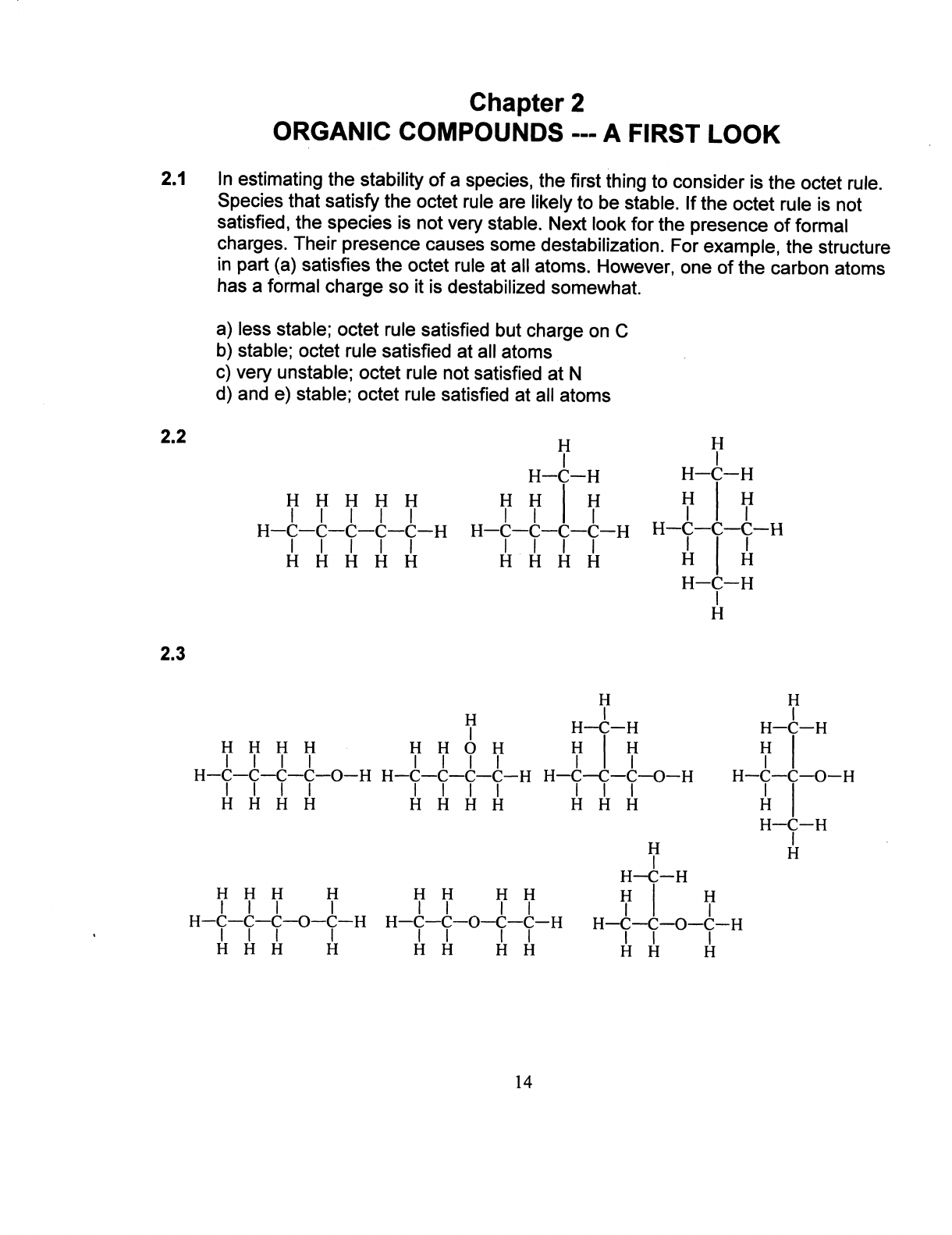 Chapter 2 ORGANIC COMPOUNDS --- A FIRST LOOK 2.1 In estimating the stability of a species, the first thing to consider is the octet rule. Species that satisfy the octet rule are likely to be stable. If the octet rule is not satisfied, the species is not very stable. Next look for the presence of formal charges. Their presence causes some destabilization. For example, the structure in part (a) satisfies the octet rule at all atoms. However, one of the carbon atoms has a formal charge so it is destabilized somewhat. a) less stable; octet rule satisfied but charge on C b) stable; octet rule satisfied at all atoms c) very unstable; octet rule not satisfied at N d) and e) stable; octet rule satisfied at all atoms 2.2 H H H C H H C H H H H H H H H H H H H C C C C C H H C C C C H H C C C H H H H H H H H H H H H H C H H 2.3 H H H H C H H C H H H H H H H H H H H H H C C C H H C C H H H H H H H H H H H H H H C H H H H C H H H H H H H H H H H H C C C C H H C C C C H H C C C H H H H H H H H H H H H 14