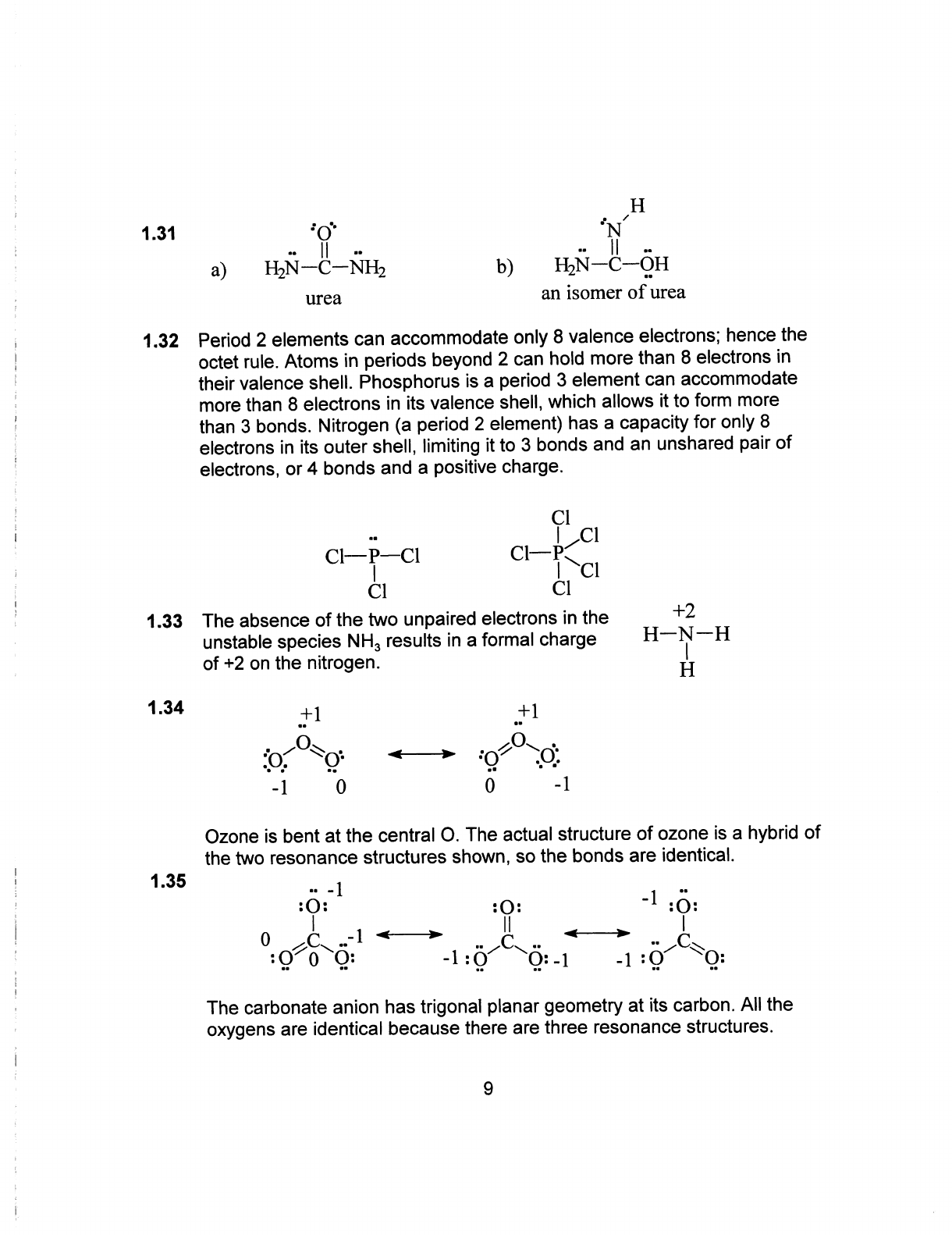 H 1.31 N : a) b) urea an isomer of urea 1.32 Period 2 elements can accommodate only 8 valence electrons; hence the octet rule. Atoms in periods beyond 2 can hold more than 8 electrons in their valence shell. Phosphorus is a period 3 element can accommodate more than 8 electrons in its valence shell, which allows it to form more than 3 bonds. Nitrogen (a period 2 element) has a capacity for only 8 electrons in its outer shell, limiting it to 3 bonds and an unshared pair of electrons, or 4 bonds and a positive charge. Cl : Cl P Cl Cl Cl Cl 1.33 The absence of the two unpaired electrons in the +2 unstable species NH₃ results in a formal charge H-N-H of +2 on the nitrogen. H 1.34 F: +1 O O -1 0 0 -1 Ozone is bent at the central O. The actual structure of ozone is a hybrid of the two resonance structures shown, so the bonds are identical. 1.35 -1 -1 0 C -1 C : C : 0 O: -1:0 -1 : The carbonate anion has trigonal planar geometry at its carbon. All the oxygens are identical because there are three resonance structures. 9
