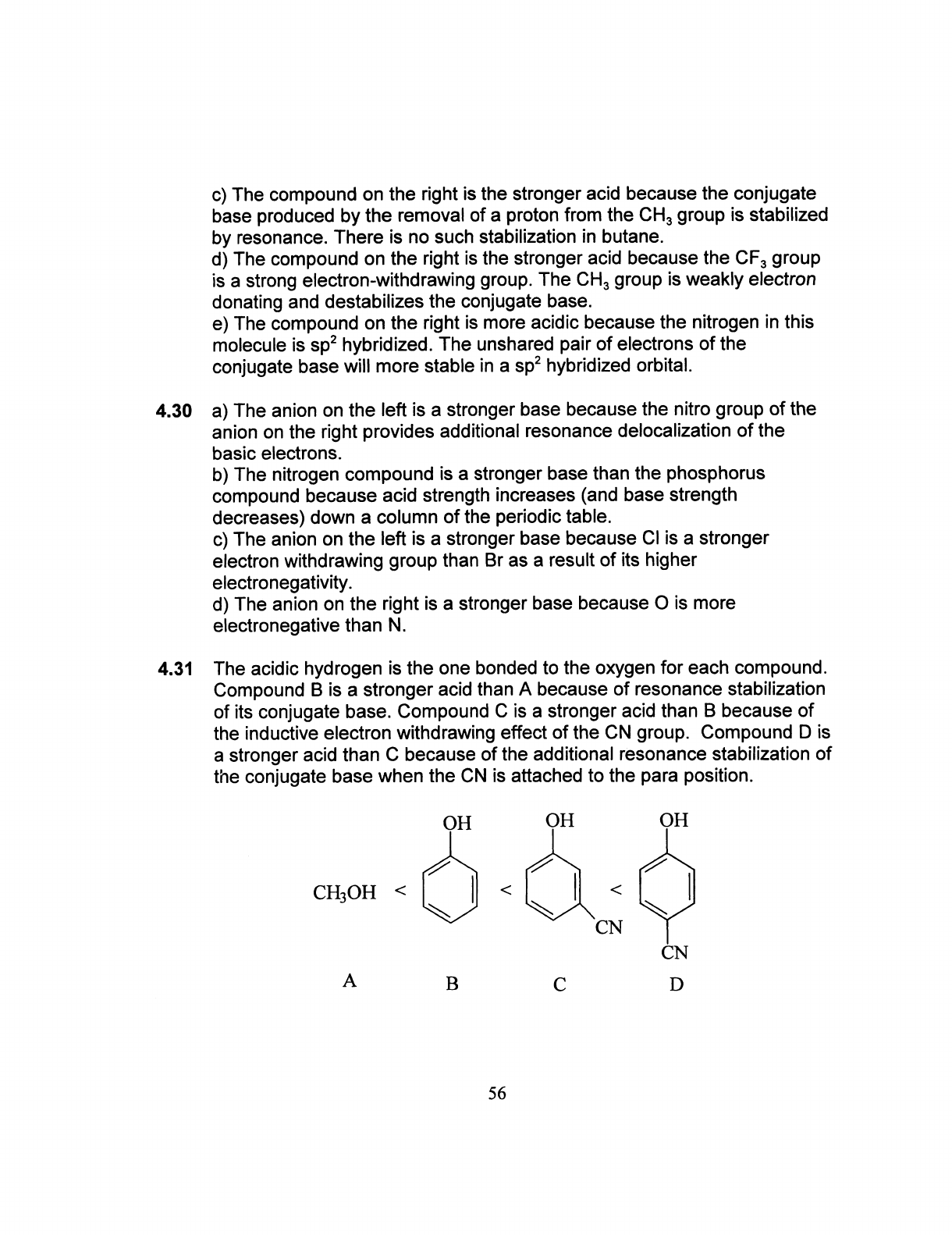 c) The compound on the right is the stronger acid because the conjugate base produced by the removal of a proton from the CH₃ group is stabilized by resonance. There is no such stabilization in butane. d) The compound on the right is the stronger acid because the CF₃ group is a strong electron-withdrawing group. The CH₃ group is weakly electron donating and destabilizes the conjugate base. e) The compound on the right is more acidic because the nitrogen in this molecule is sp² hybridized. The unshared pair of electrons of the conjugate base will more stable in a sp² hybridized orbital. 4.30 a) The anion on the left is a stronger base because the nitro group of the anion on the right provides additional resonance delocalization of the basic electrons. b) The nitrogen compound is a stronger base than the phosphorus compound because acid strength increases (and base strength decreases) down a column of the periodic table. c) The anion on the left is a stronger base because CI is a stronger electron withdrawing group than Br as a result of its higher electronegativity. d) The anion on the right is a stronger base because is more electronegative than N. 4.31 The acidic hydrogen is the one bonded to the oxygen for each compound. Compound B is a stronger acid than A because of resonance stabilization of its conjugate base. Compound C is a stronger acid than B because of the inductive electron withdrawing effect of the CN group. Compound D is a stronger acid than C because of the additional resonance stabilization of the conjugate base when the CN is attached to the para position. OH OH OH CH₃OH V V V CN CN A B C D 56