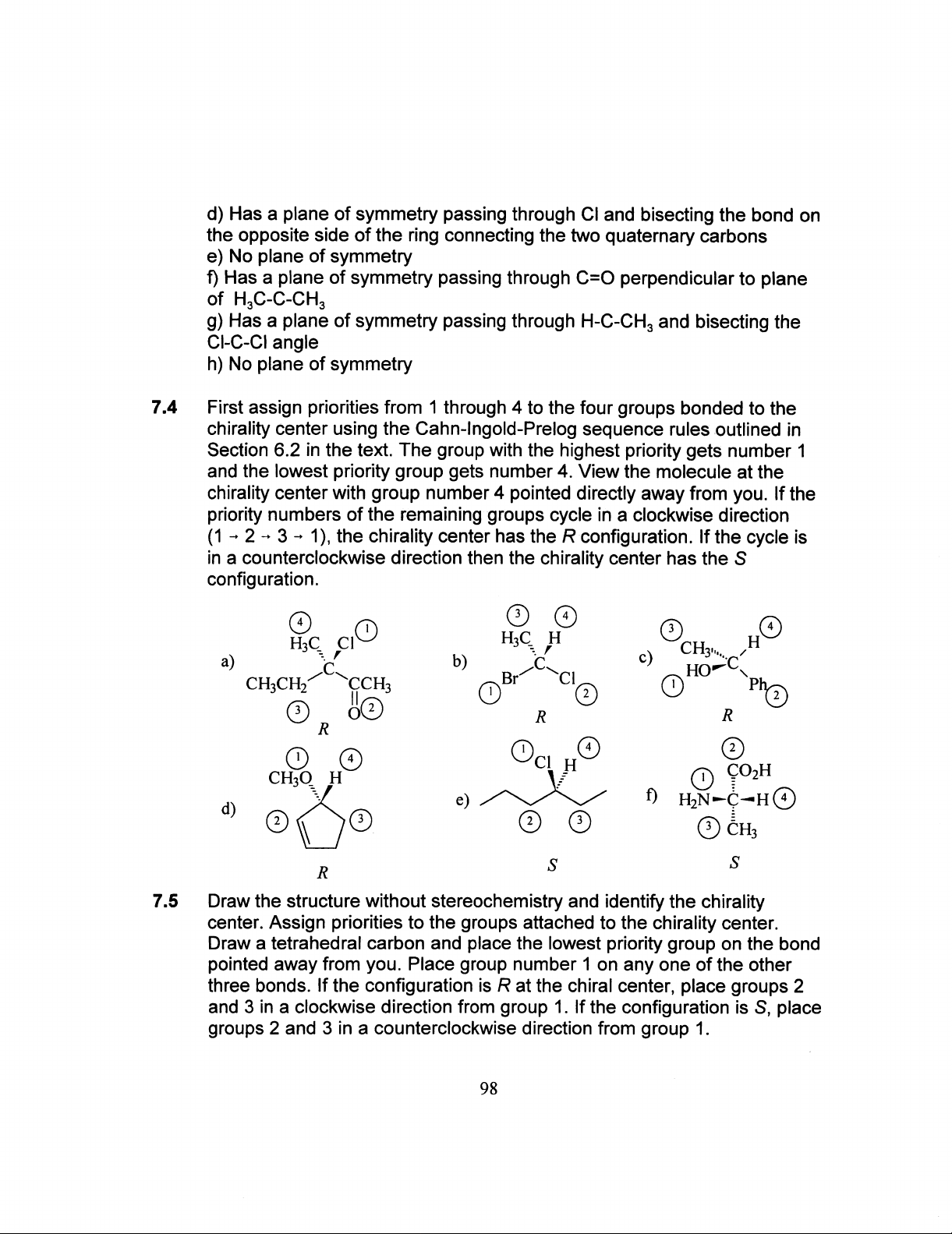 d) Has a plane of symmetry passing through CI and bisecting the bond on the opposite side of the ring connecting the two quaternary carbons e) No plane of symmetry f) Has a plane of symmetry passing through C=O perpendicular to plane of g) Has a plane of symmetry passing through H-C-CH₃ and bisecting the CI-C-CI angle h) No plane of symmetry 7.4 First assign priorities from 1 through 4 to the four groups bonded to the chirality center using the Cahn-Ingold-Prelog sequence rules outlined in Section 6.2 in the text. The group with the highest priority gets number 1 and the lowest priority group gets number 4. View the molecule at the chirality center with group number 4 pointed directly away from you. If the priority numbers of the remaining groups cycle in a clockwise direction (1 2 3 -> 1), the chirality center has the R configuration. If the cycle is in a counterclockwise direction then the chirality center has the S configuration. 3 4 4 1 3 4 H₃C C H a) c) H C b) C HO C CH₃CH₂ CCH₃ Br 1 Ph 1 2 2 3 2 R R R 1 4 2 1 4 Cl H CH₃O H 1 d) e) f) H₂N C H 4 2 3 2 3 3 CH₃ R S S 7.5 Draw the structure without stereochemistry and identify the chirality center. Assign priorities to the groups attached to the chirality center. Draw a tetrahedral carbon and place the lowest priority group on the bond pointed away from you. Place group number 1 on any one of the other three bonds. If the configuration is R at the chiral center, place groups 2 and 3 in a clockwise direction from group 1. If the configuration is S, place groups 2 and 3 in a counterclockwise direction from group 1. 98