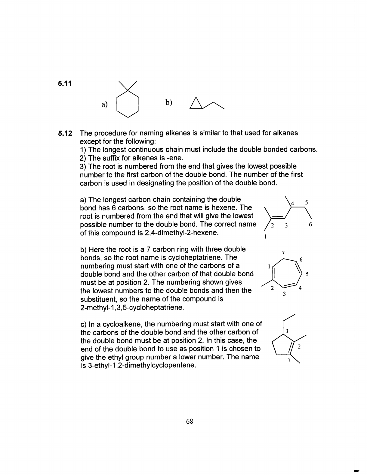 5.11 a) b) 5.12 The procedure for naming alkenes is similar to that used for alkanes except for the following: 1) The longest continuous chain must include the double bonded carbons. 2) The suffix for alkenes is -ene. 3) The root is numbered from the end that gives the lowest possible number to the first carbon of the double bond. The number of the first carbon is used in designating the position of the double bond. a) The longest carbon chain containing the double 4 5 bond has 6 carbons, so the root name is hexene. The root is numbered from the end that will give the lowest possible number to the double bond. The correct name 2 3 6 of this compound is 1 b) Here the root is a 7 carbon ring with three double 7 bonds, so the root name is cycloheptatriene. The 6 numbering must start with one of the carbons of a 1 double bond and the other carbon of that double bond 5 must be at position 2. The numbering shown gives the lowest numbers to the double bonds and then the 2 4 3 substituent, so the name of the compound is c) In a cycloalkene, the numbering must start with one of the carbons of the double bond and the other carbon of 3 the double bond must be at position 2. In this case, the end of the double bond to use as position 1 is chosen to 2 give the ethyl group number a lower number. The name 1 is 3-ethyl-1,2-dimethylcyclopentene. 68