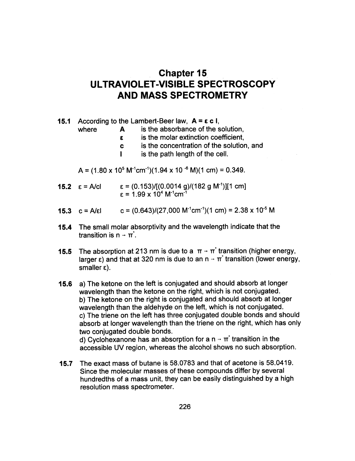 Chapter 15 ULTRAVIOLET-VISIBLE SPECTROSCOPY AND MASS SPECTROMETRY 15.1 According to the Lambert-Beer law, where A is the absorbance of the solution, E is the molar extinction coefficient, is the concentration of the solution, and I is the path length of the cell. A = (1.80 X 10⁵ X 10 -6 M)(1 cm) = 0.349. 15.2 = A/cl = (0.153)/[(0.0014 g)/(182 g M⁻¹)][1 cm] = 1.99 X 10⁴ M⁻¹cm⁻¹ 15.3 C = A/εl C = (0.643)/(27,000 cm) = 2.38 X 10⁻⁵ M 15.4 The small molar absorptivity and the wavelength indicate that the transition is 15.5 The absorption at 213 nm is due to a transition (higher energy, larger ε) and that at 320 nm is due to an transition (lower energy, smaller ε). 15.6 a) The ketone on the left is conjugated and should absorb at longer wavelength than the ketone on the right, which is not conjugated. b) The ketone on the right is conjugated and should absorb at longer wavelength than the aldehyde on the left, which is not conjugated. c) The triene on the left has three conjugated double bonds and should absorb at longer wavelength than the triene on the right, which has only two conjugated double bonds. d) Cyclohexanone has an absorption for a transition in the accessible UV region, whereas the alcohol shows no such absorption. 15.7 The exact mass of butane is 58.0783 and that of acetone is 58.0419. Since the molecular masses of these compounds differ by several hundredths of a mass unit, they can be easily distinguished by a high resolution mass spectrometer. 226