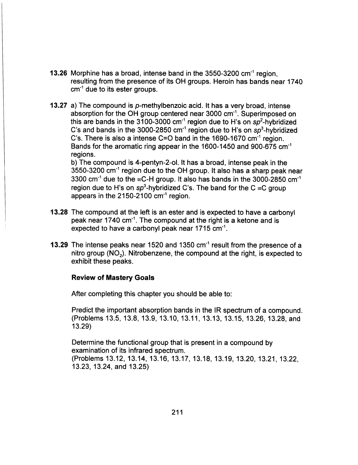 13.26 Morphine has a broad, intense band in the 3550-3200 cm⁻¹ region, resulting from the presence of its OH groups. Heroin has bands near 1740 cm⁻¹ due to its ester groups. 13.27 a) The compound is p-methylbenzoic acid. It has a very broad, intense absorption for the OH group centered near 3000 cm⁻¹. Superimposed on this are bands in the 3100-3000 cm⁻¹ region due to H's on sp²-hybridized C's and bands in the 3000-2850 cm⁻¹ region due to H's on sp³-hybridized C's. There is also a intense C=O band in the 1690-1670 cm⁻¹ region. Bands for the aromatic ring appear in the 1600-1450 and 900-675 cm⁻¹ regions. b) The compound is 4-pentyn-2-ol. It has a broad, intense peak in the 3550-3200 cm⁻¹ region due to the OH group. It also has a sharp peak near 3300 cm⁻¹ due to the =C-H group. It also has bands in the 3000-2850 cm⁻¹ region due to H's on sp³-hybridized C's. The band for the C group appears in the 2150-2100 cm⁻¹ region. 13.28 The compound at the left is an ester and is expected to have a carbonyl peak near 1740 cm⁻¹. The compound at the right is a ketone and is expected to have a carbonyl peak near 1715 cm⁻¹. 13.29 The intense peaks near 1520 and 1350 cm⁻¹ result from the presence of a nitro group (NO₂). Nitrobenzene, the compound at the right, is expected to exhibit these peaks. Review of Mastery Goals After completing this chapter you should be able to: Predict the important absorption bands in the IR spectrum of a compound. (Problems 13.5, 13.8, 13.9, 13.10, 13.11, 13.13, 13.15, 13.26, 13.28, and 13.29) Determine the functional group that is present in a compound by examination of its infrared spectrum. (Problems 13.12, 13.14, 13.16, 13.17, 13.18, 13.19, 13.20, 13.21, 13.22, 13.23, 13.24, and 13.25) 211