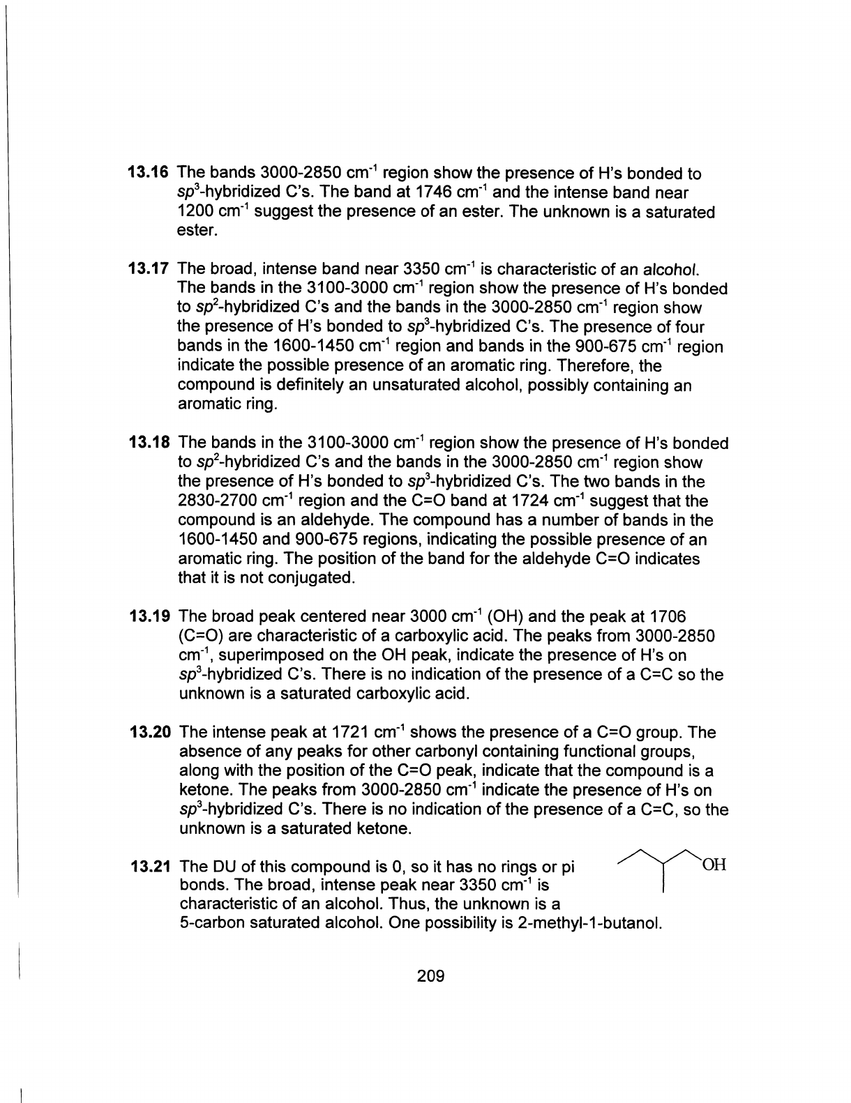 13.16 The bands 3000-2850 cm⁻¹ region show the presence of H's bonded to sp³-hybridized C's. The band at 1746 cm⁻¹ and the intense band near 1200 cm⁻¹ suggest the presence of an ester. The unknown is a saturated ester. 13.17 The broad, intense band near 3350 cm⁻¹ is characteristic of an alcohol. The bands in the 3100-3000 cm⁻¹ region show the presence of H's bonded to sp²-hybridized C's and the bands in the 3000-2850 cm⁻¹ region show the presence of H's bonded to sp³-hybridized C's. The presence of four bands in the 1600-1450 cm⁻¹ region and bands in the 900-675 cm⁻¹ region indicate the possible presence of an aromatic ring. Therefore, the compound is definitely an unsaturated alcohol, possibly containing an aromatic ring. 13.18 The bands in the 3100-3000 cm⁻¹ region show the presence of H's bonded to sp²-hybridized C's and the bands in the 3000-2850 cm⁻¹ region show the presence of H's bonded to sp³-hybridized C's. The two bands in the 2830-2700 cm⁻¹ region and the C=O band at 1724 cm⁻¹ suggest that the compound is an aldehyde. The compound has a number of bands in the 1600-1450 and 900-675 regions, indicating the possible presence of an aromatic ring. The position of the band for the aldehyde C=O indicates that it is not conjugated. 13.19 The broad peak centered near 3000 cm⁻¹ (OH) and the peak at 1706 (C=O) are characteristic of a carboxylic acid. The peaks from 3000-2850 cm⁻¹, superimposed on the OH peak, indicate the presence of H's on sp³-hybridized C's. There is no indication of the presence of a C=C so the unknown is a saturated carboxylic acid. 13.20 The intense peak at 1721 cm⁻¹ shows the presence of a C=O group. The absence of any peaks for other carbonyl containing functional groups, along with the position of the C=O peak, indicate that the compound is a ketone. The peaks from 3000-2850 cm⁻¹ indicate the presence of H's on sp³-hybridized C's. There is no indication of the presence of a C=C, so the unknown is a saturated ketone. 13.21 The DU of this compound is 0, so it has no rings or pi OH bonds. The broad, intense peak near 3350 cm⁻¹ is characteristic of an alcohol. Thus, the unknown is a 5-carbon saturated alcohol. One possibility is 2-methyl-1-butanol. 209