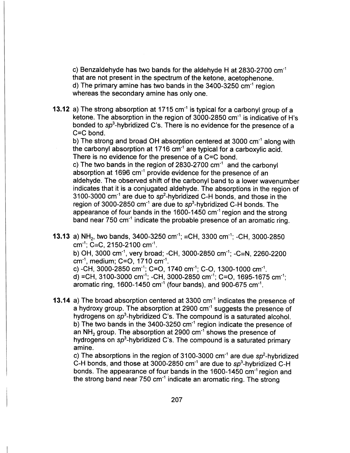 c) Benzaldehyde has two bands for the aldehyde H at 2830-2700 cm⁻¹ that are not present in the spectrum of the ketone, acetophenone. d) The primary amine has two bands in the 3400-3250 cm⁻¹ region whereas the secondary amine has only one. 13.12 a) The strong absorption at 1715 cm⁻¹ is typical for a carbonyl group of a ketone. The absorption in the region of 3000-2850 cm⁻¹ is indicative of H's bonded to sp³-hybridized C's. There is no evidence for the presence of a C=C bond. b) The strong and broad OH absorption centered at 3000 cm⁻¹ along with the carbonyl absorption at 1716 cm⁻¹ are typical for a carboxylic acid. There is no evidence for the presence of a C=C bond. c) The two bands in the region of 2830-2700 cm⁻¹ and the carbonyl absorption at 1696 cm⁻¹ provide evidence for the presence of an aldehyde. The observed shift of the carbonyl band to a lower wavenumber indicates that it is a conjugated aldehyde. The absorptions in the region of 3100-3000 cm⁻¹ are due to sp²-hybridized C-H bonds, and those in the region of 3000-2850 cm⁻¹ are due to sp³-hybridized C-H bonds. The appearance of four bands in the 1600-1450 cm⁻¹ region and the strong band near 750 cm⁻¹ indicate the probable presence of an aromatic ring. 13.13 a) NH₂, two bands, 3400-3250 cm⁻¹; =CH, 3300 cm⁻¹; -CH, 3000-2850 cm⁻¹; C=C, 2150-2100 cm⁻¹. b) OH, 3000 cm⁻¹, very broad; -CH, 3000-2850 cm⁻¹; -C=N, 2260-2200 cm⁻¹, medium; C=O, 1710 cm⁻¹. c) -CH, 3000-2850 cm⁻¹; C=O, 1740 cm⁻¹; C-O, 1300-1000 cm⁻¹. d) =CH, 3100-3000 cm⁻¹; -CH, 3000-2850 cm⁻¹; C=O, 1695-1675 cm⁻¹; aromatic ring, 1600-1450 cm⁻¹ (four bands), and 900-675 cm⁻¹. 13.14 a) The broad absorption centered at 3300 cm⁻¹ indicates the presence of a hydroxy group. The absorption at 2900 cm⁻¹ suggests the presence of hydrogens on sp³-hybridized C's. The compound is a saturated alcohol. b) The two bands in the 3400-3250 cm⁻¹ region indicate the presence of an NH₂ group. The absorption at 2900 cm⁻¹ shows the presence of hydrogens on sp³-hybridized C's. The compound is a saturated primary amine. c) The absorptions in the region of 3100-3000 cm⁻¹ are due sp²-hybridized C-H bonds, and those at 3000-2850 cm⁻¹ are due to sp³-hybridized C-H bonds. The appearance of four bands in the 1600-1450 cm⁻¹ region and the strong band near 750 cm⁻¹ indicate an aromatic ring. The strong 207