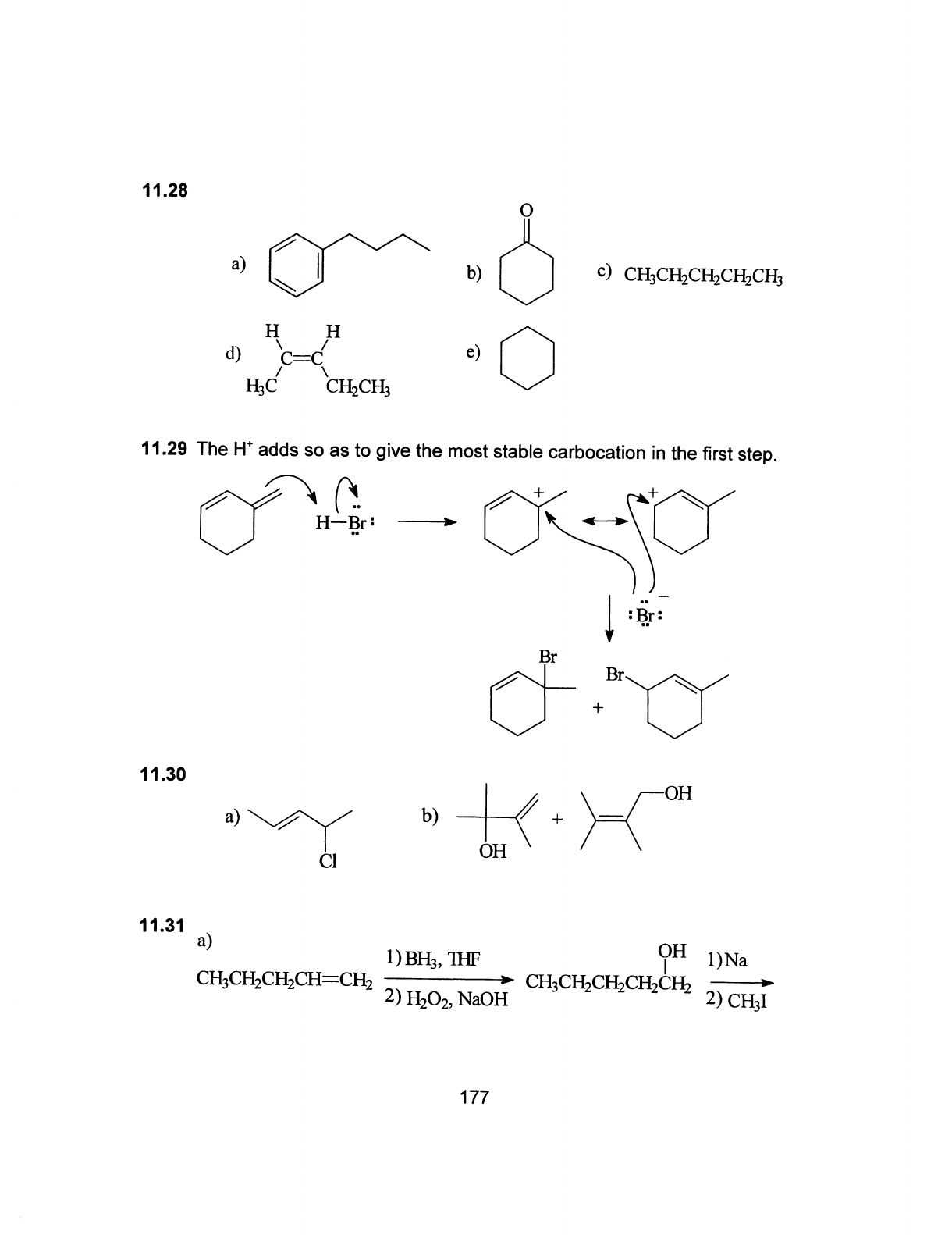 11.28 O a) b) c) CH₃CH₂CH₂CH₂CH₃ H H d) C=C e) H₃C CH₂CH₃ 11.29 The adds so as to give the most stable carbocation in the first step. + + H-Br: :Br: Br Br + 11.30 OH a) b) + OH 11.31 a) 1) BH₃, THF OH 1)Na CH₃CH₂CH₂CH=CH₂ CH₃CH₂CH₂CH₂CH₂ 2) H₂O₂, NaOH 2) CH₃I 177