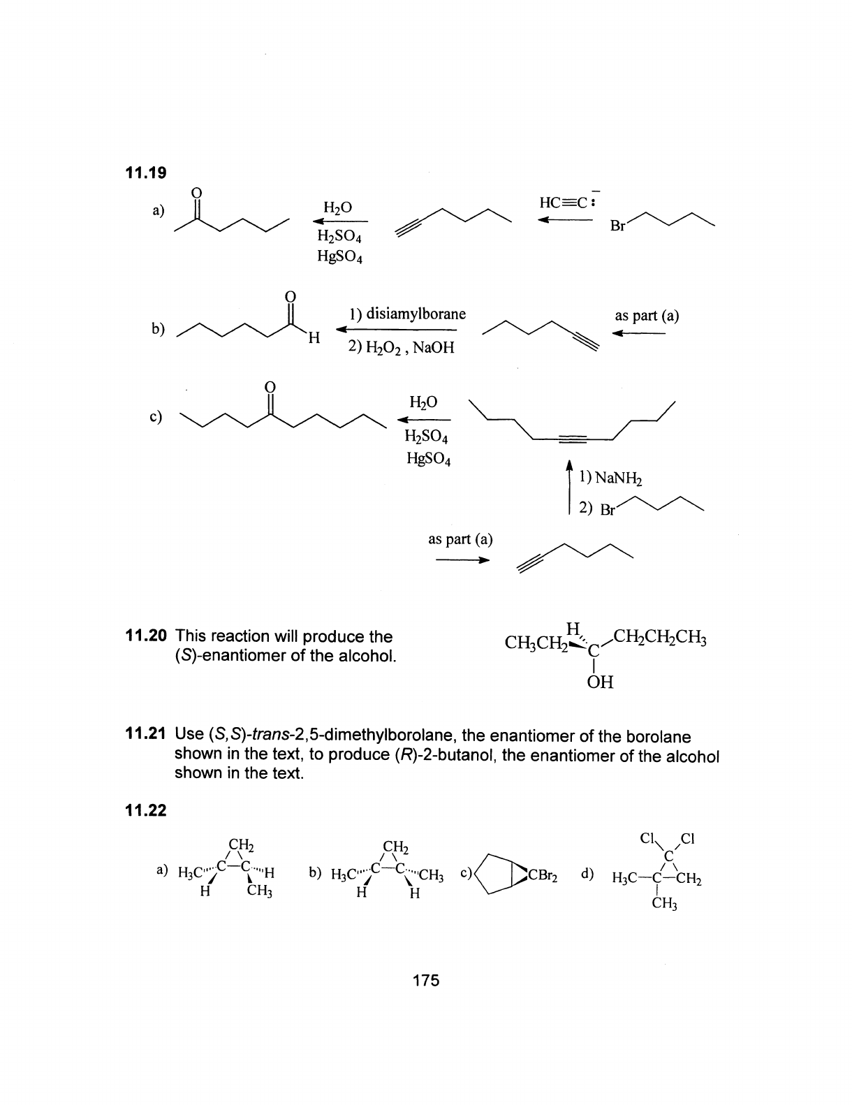 11.19 O a) H₂O HC=C: Br H₂SO₄ O 1) disiamylborane as part (a) b) H 2) H₂O₂, , NaOH O H₂O c) H₂SO₄ 1) NaNH₂ 2) Br as part (a) 11.20 This reaction will produce the H CH₃CH₂ CH₂CH₂CH₃ (S)-enantiomer of the alcohol. C OH 11.21 Use (S,S)-trans-2,5-dimethylborolane the enantiomer of the borolane shown in the text, to produce (R)-2-butanol, the enantiomer of the alcohol shown in the text. 11.22 CI CH₂ CH₂ C a) C C H b) C C CH₃ c) CBr₂ d) H₃C C CH₂ H CH₃ H H CH₃ 175