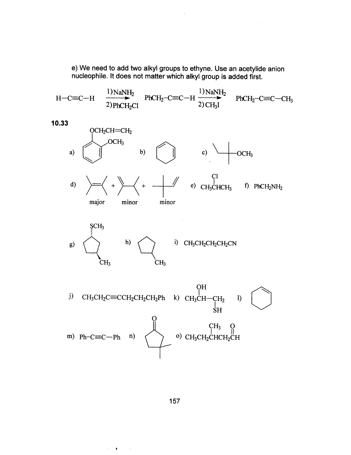 e) We need to add two alkyl groups to ethyne. Use an acetylide anion nucleophile. It does not matter which alkyl group is added first. 1)NaNH₂ 1)NaNH₂ H-C=C-H PhCH₂-C=C-H PhCH₂-C=C-CH₃ 2)PhCH₂Cl 2) CH₃I 10.33 OCH₃ a) b) c) OCH₃ d) + + e) CH₃CHCH₃ f) PhCH₂NH₂ major minor minor SCH₃ g) h) i) CH₃CH₂CH₂CH₂CN CH₃ CH₃ OH j) k) 1) SH O CH₃ O m) Ph-C=C-Ph n) o) CH₃CH₂CHCH₂CH 157