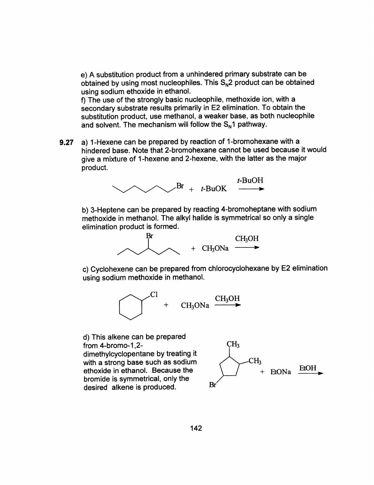 e) A substitution product from a unhindered primary substrate can be obtained by using most nucleophiles. This SN2 product can be obtained using sodium ethoxide in ethanol. f) The use of the strongly basic nucleophile, methoxide ion, with a secondary substrate results primarily in E2 elimination. To obtain the substitution product, use methanol, a weaker base, as both nucleophile and solvent. The mechanism will follow the SN1 pathway. 9.27 a) 1-Hexene can be prepared by reaction of 1-bromohexane with a hindered base. Note that 2-bromohexane cannot be used because it would give a mixture of 1-hexene and 2-hexene, with the latter as the major product. t-BuOH Br + t-BuOK b) 3-Heptene can be prepared by reacting 4-bromoheptane with sodium methoxide in methanol. The alkyl halide is symmetrical so only a single elimination product is formed. Br CH₃OH + CH₃ONa c) Cyclohexene can be prepared from chlorocyclohexane by E2 elimination using sodium methoxide in methanol. Cl + CH₃ONa d) This alkene can be prepared from 4-bromo-1,2- CH₃ dimethylcyclopentane by treating it with a strong base such as sodium CH₃ ethoxide in ethanol. Because the EtOH + EtONa bromide is symmetrical, only the desired alkene is produced. Br 142