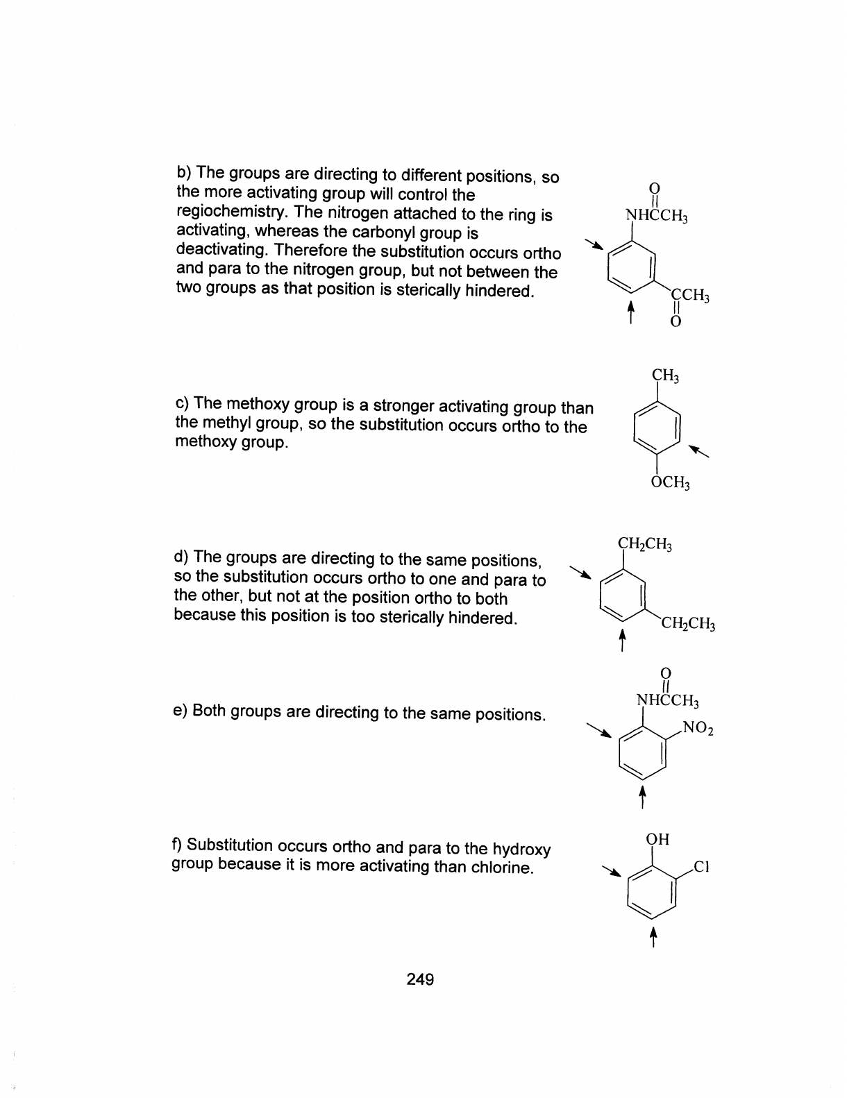 b) The groups are directing to different positions, so the more activating group will control the O regiochemistry. The nitrogen attached to the ring is NHCCH₃ activating, whereas the carbonyl group is deactivating. Therefore the substitution occurs ortho and para to the nitrogen group, but not between the two groups as that position is sterically hindered. CCH₃ O CH₃ c) The methoxy group is a stronger activating group than the methyl group, so the substitution occurs ortho to the methoxy group. OCH₃ CH₂CH₃ d) The groups are directing to the same positions, so the substitution occurs ortho to one and para to the other, but not at the position ortho to both because this position is too sterically hindered. CH₂CH₃ O NHCCH₃ e) Both groups are directing to the same positions. NO₂ f) Substitution occurs ortho and para to the hydroxy OH group because it is more activating than chlorine. 249