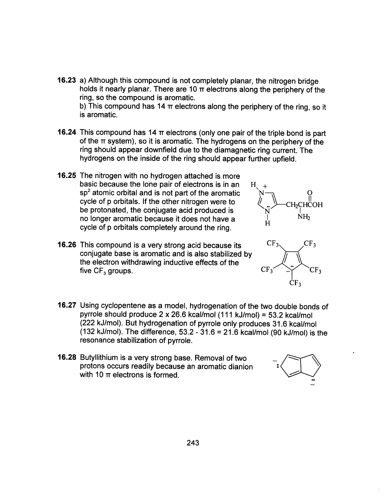 16.23 a) Although this compound is not completely planar, the nitrogen bridge holds it nearly planar. There are 10 TT electrons along the periphery of the ring, so the compound is aromatic. b) This compound has 14 TT electrons along the periphery of the ring, so it is aromatic. 16.24 This compound has 14 TT electrons (only one pair of the triple bond is part of the TT system), so it is aromatic. The hydrogens on the periphery of the ring should appear downfield due to the diamagnetic ring current. The hydrogens on the inside of the ring should appear further upfield. 16.25 The nitrogen with no hydrogen attached is more basic because the lone pair of electrons is in an H + sp² atomic orbital and is not part of the aromatic N cycle of p orbitals. If the other nitrogen were to be protonated, the conjugate acid produced is N no longer aromatic because it does not have a NH₂ H cycle of p orbitals completely around the ring. 16.26 This compound is a very strong acid because its CF₃ CF₃ conjugate base is aromatic and is also stabilized by the electron withdrawing inductive effects of the five CF₃ groups. CF₃ CF₃ CF₃ 16.27 Using cyclopentene as a model, hydrogenation of the two double bonds of pyrrole should produce 2 X 26.6 kcal/mol (111 kJ/mol) = 53.2 kcal/mol (222 kJ/mol). But hydrogenation of pyrrole only produces 31.6 kcal/mol (132 kJ/mol). The difference, 53.2 - 31.6 = 21.6 kcal/mol (90 kJ/mol) is the resonance stabilization of pyrrole. 16.28 Butyllithium is a very strong base. Removal of two protons occurs readily because an aromatic dianion : with 10 TT electrons is formed. 243