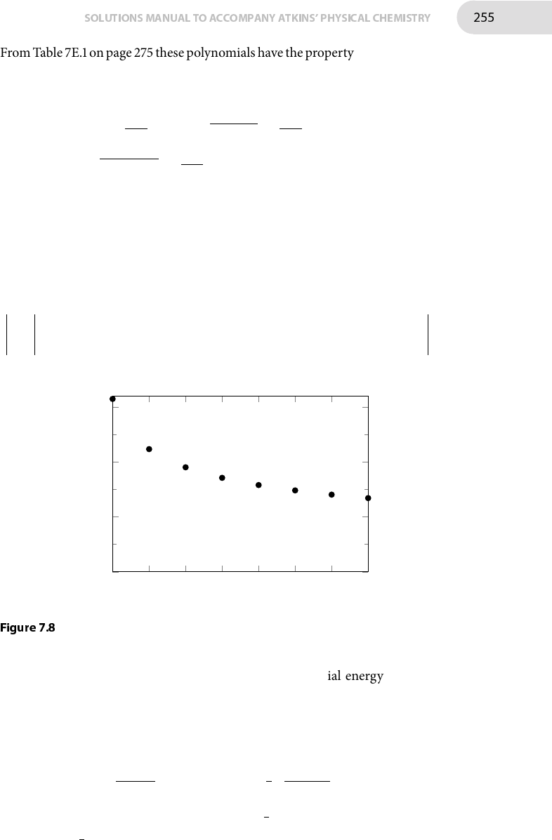 SOLUTIONSMANUAL TO ACCOMPANY ATKINS' PHYSICAL CHEMISTRY 255 FromTable 7E.1 onpage 275 these polynomials have the property ∫ ∞ −∞H 2 υe−y 2 dy = π1/22υυ! so it follows that N2υ = 1/(π1/22υυ!). �e probability of �nding the particle outside the range of the turning points is then Pυ = 2∫ ∞ √ 2υ+1 ∣ψυ ∣2 dy = 2 π1/22υυ! ∫ ∞ √ 2υ+1 H2υ e −y2 dy = 1 π1/22υ−1υ! ∫ ∞ √ 2υ+1 H2υ e −y2 dy �e integral is evaluated using mathematical so�ware to give the results in the following which are plotted in Fig. 7.8. �e probability of a classical oscillator being found in a non-classical region is, of course, zero and the correspondence principle indicates that the quantum result must converge to this value as the quantumnumber becomes large.�e results show that P is indeed a decreasing function of υ, albeit rather slowly. �e probability reduces to about 0.02 for υ = 200. υ 0 1 2 3 4 5 6 7 Pυ 0.157 0.112 0.0951 0.0855 0.0789 0.0740 0.0702 0.0670 0 1 2 3 4 5 6 7 0.00 0.05 0.10 0.15 υ P υ Figure 7.8 P7E.16 Oscillations are expected about a minimum in the potential energy, because this corresponds to the equilibrium arrangement. For a potential of the form V = V0 cos 3ϕ, the (�rst) minimum is when 3ϕ = π, that is ϕ = π/3 or 60○.�e form of the potential close to theminimum is found by expanding the function in a Taylor series about the point ϕ = π/3 V/V0 = V(π/3) + (dV(ϕ) dϕ ) ϕ=π/3 (ϕ − π/3) + 1 2 ( d2V(ϕ) dϕ2 ) ϕ=π/3 (ϕ − π/3)2 = cos(π) + (−3 sin 3ϕ)ϕ=π/3(ϕ − π/3) + 1 2 (−9 cos 3ϕ)ϕ=π/3(ϕ − π/3)2 = −1 + 1 2 × 9(ϕ − π/3)2