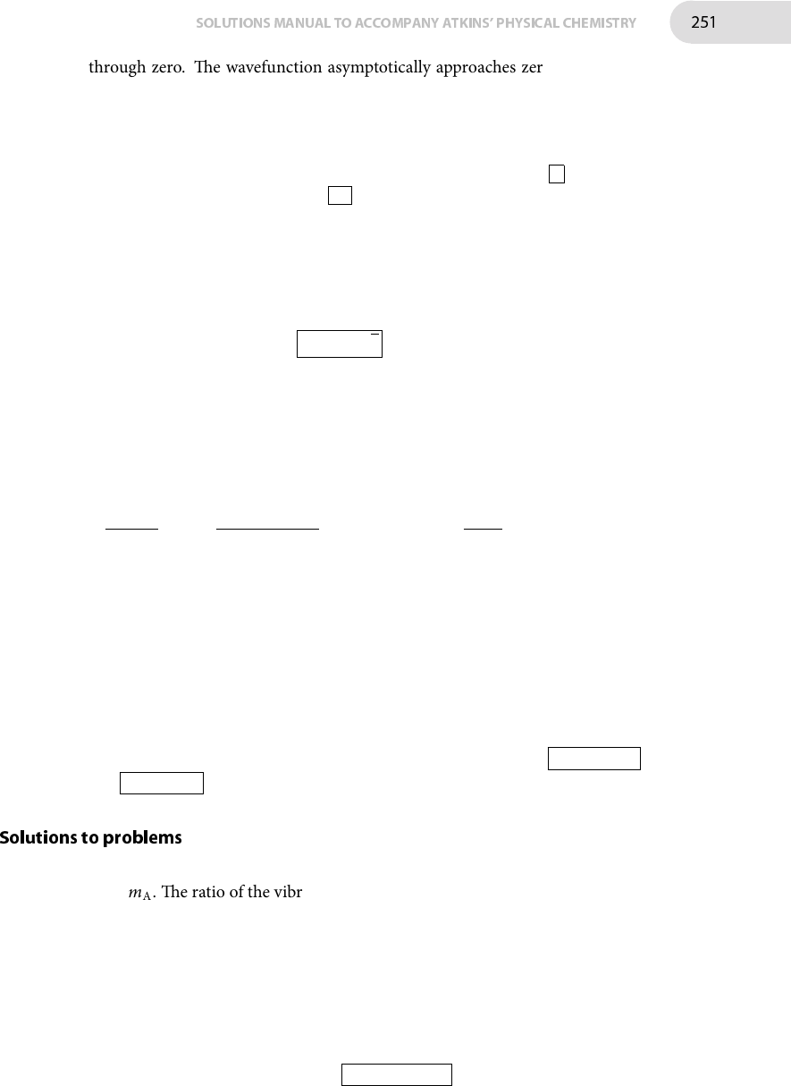 SOLUTIONSMANUAL TO ACCOMPANY ATKINS' PHYSICAL CHEMISTRY 251 through zero. �e wavefunction asymptotically approaches zero at y = ±∞, but as the function does not pass through zero these limits do not count as nodes.�e nodes in the wavefunction therefore correspond to the solutions of Hυ(y) = 0. Hυ(y) is a polynomial of order υ, meaning that the highest power of y that occurs is yυ ; such polynomials in general have υ solutions and hence there are υ nodes.�erefore (a) the wavefunction with υ = 5 has 5 nodes; (b) the wavefunction with υ = 35 has 35 nodes. E7E.8(b) �e wavefunction with υ = 3 is ψ3(y) = N3(y3 −3y)e−y 2/2. Nodes occur when the wavefunction passes through zero; the wavefunction approaches zero at y = ±∞, but these do not count as nodes as the wavefunction does not pass through zero. It is evident that the nodes occur when y3 − 3y = y(y2 − 3) = 0 which solves to give nodes at y = 0,± √ 3 . E7E.9(b) �e wavefunction with υ = 3 is ψ3(y) = N3(8y3 − 12y)e−y 2/2, which gives a probability density of P(y) = ∣ψ3(y)∣2= N23(8y3 − 12y)2e−y 2 .�e extrema are located by di�erentiating the wavefunction, setting the result to 0 and solving for y.�e di�erential is evaluated using the product rule dψ3(y) dy = N23 ⎛ ⎝ d(8y3 − 12y)2 dy e−y 2 + (8y3 − 12y)2 de −y2 dy ⎞ ⎠ = N23 [2(8y3 − 12y)(24y2 − 12)e−y 2 + (8y3 − 12y)2 × (−2ye−y 2 )] It is necessary to usemathematical so�ware to �nd the solutions of dψ3(y)/dy = 0; these solutions are 0.000 ± 0.6021 ± 1.225 ± 2.0341 ±∞ It is evident from inspection of the wavefunction that y = 0 is a mimimum in the probability density, and that there is also a minimum when (8y2 − 12) = 0, which corresponds to y = ±1.225. It follows thatmaxima occur at y = ±0.6021 and y = ±2.034 . Solutions to problems P7E.2 (a) In the case that mB ≫ mA, mA + mB ≈ mB, and so µAB ≈ mAmB/mB = mA.�e ratio of the vibrational frequencies is then ωA′B = ωAB(µAB/µA′B)1/2 ≈ ωAB(mA/mA′)1/2 If the frequencies are expressed in Hz the analogous result is νA′B ≈ νAB(mA/mA′)1/2 (b) Using the previous result gives ν 2H35Cl ≈ ν 1H35Cl(m 1H/m 2H)1/2 = (5.63 × 1014 Hz) × (1 mu/2 mu)1/2 = 3.98 × 1014 Hz .