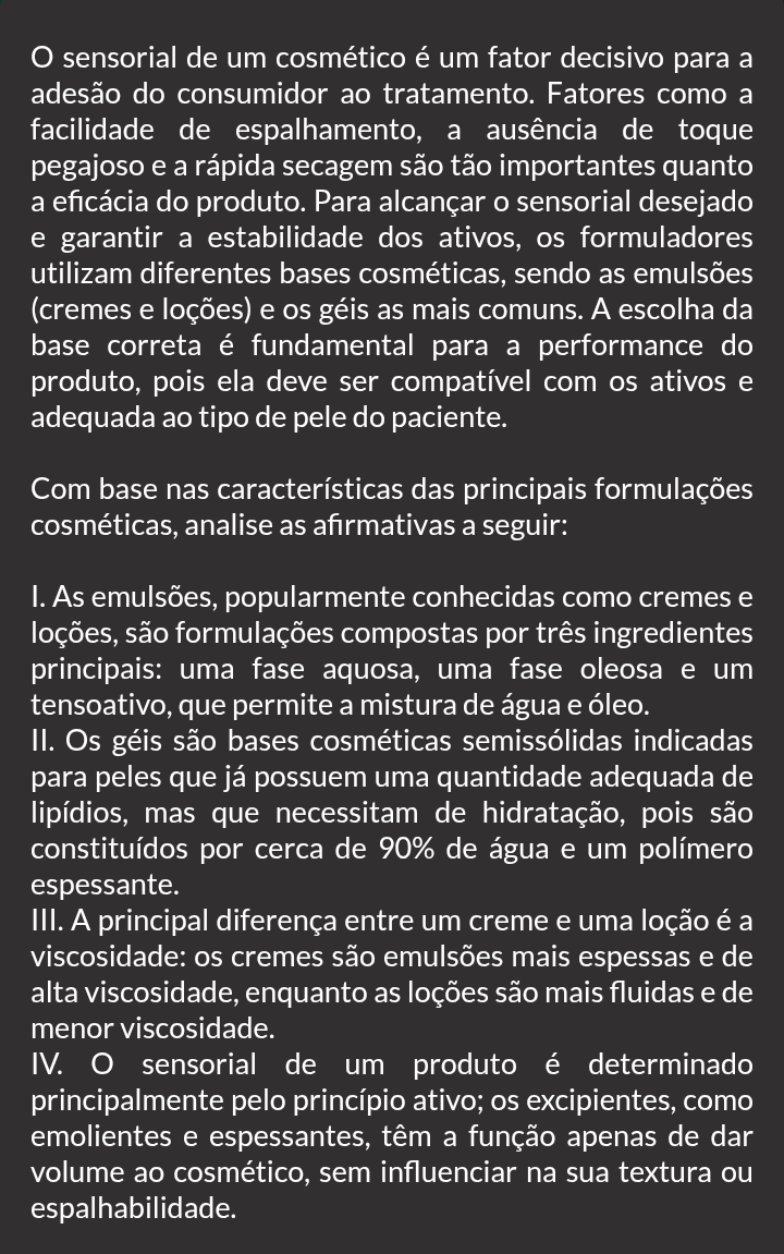 sensorial de um cosmético é um fator decisivo para a adesão do consumidor ao tratamento. Fatores como a facilidade de espalhamento, a ausência de toque pegajoso e a rápida secagem são tão importantes quanto a eficácia do produto. Para alcançar o sensorial desejado e garantir a estabilidade dos ativos, os formuladores utilizam diferentes bases cosméticas, sendo as emulsões (cremes e loções) e os géis as mais comuns. A escolha da base correta é fundamental para a performance do produto, pois ela deve ser compatível com os ativos e adequada ao tipo de pele do paciente. Com base nas características das principais formulações cosméticas, analise as afirmativas a seguir: I. As emulsões, popularmente conhecidas como cremes e loções, são formulações compostas por três ingredientes principais: uma fase aquosa, uma fase oleosa e um tensoativo, que permite a mistura de água e óleo. II. Os géis são bases cosméticas semissólidas indicadas para peles que já possuem uma quantidade adequada de lipídios, mas que necessitam de hidratação, pois são constituídos por cerca de 90% de água e um polímero espessante. III. A principal diferença entre um creme e uma loção é a viscosidade: os cremes são emulsões mais espessas e de alta viscosidade, enquanto as loções são mais fluidas e de menor viscosidade. IV. sensorial de um produto é determinado principalmente pelo princípio ativo; os excipientes, como emolientes e espessantes, têm a função apenas de dar volume ao cosmético, sem influenciar na sua textura ou espalhabilidade.