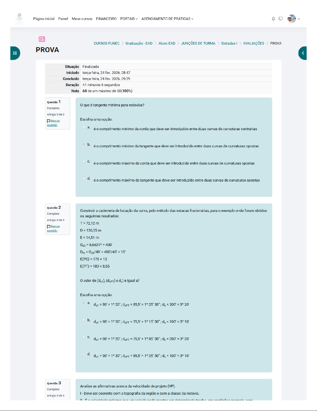 Página inicial Painel Meus cursos FINANCEIRO PORTAIS AGENDAMENTO DE PRÁTICAS CURSOS FUNEC Graduação EAD Aluno EAD JUNÇÕES DE TURMA Estradas AVALIAÇÕES PROVA PROVAMarcar que um em em condições questão segurança. III- É a média de velocidades para todo o tráfego ou parte dele, obtida pela soma das distâncias percorridas dividida pelo tempo de percurso. IV- Condiciona as principais características das vias: curvatura, superlargura, distância de visibilidade. Escolha uma opção: a. Apenas item III é falso. b. Apenas item é falso. Todas as alternativas são falsas. d. Todas as alternativas são verdadeiras. Questão 4 Calcular a distância de visibilidade de parada excepcional, numa estrada plana (i = 0 m/m), onde a velocidade diretriz Completo ou de projeto é 100 km/h. Para velocidade diretriz de 100 km/h, tem-se na Tabela que coeficiente de atrito Atingiu 3 de 3 longitudinal pneu/pavimento (f) é igual a 0,28. Então Dp é igual a: Marcar Escolha uma opção: a. 71,40 m b. 210 m 70 m d. 140 m Questão 5 Numa rodovia de 3.000 metros de comprimento, a numeração final da última estaca é: Completo Atingiu 3 de 3 Marcar Escolha uma opção: questão a. 30 b. 300 150 d. 60 Questão 6 De acordo com as classes do projeto, uma rodovia de pista simples, as quais podem ser subdivididas em estradas Completo Classe A (veículos, bidirecionais, VMD 50 A 300 veículos) e estradas Classe (VMDClasse 0 d. Classe 6 Questão 7 As Rodovias federais no Brasil são identificadas pela sigla BR, seguindo-se um traço, uma centena, uma barra e outra Completo sigla correspondente ao estado da federação onde está implantada. primeiro algarismo define a direção dominante Atingiu de 3 da rodovia, marque a alternativa que apresenta corretamente as rodovias radiais, transversais, longitudinais, Marcar diagonais e de ligação, nesta ordem. questão Escolha uma opção: a. 0,2,1,3,4 b. 1,2,3,4,0 C. 0,1,2,3,4 d. 4,3,2,1,0 Questão 8 Baseado no traçado apresentado e nos dados fornecidos, calcule elementos solicitados para projetar uma curva Completo circular simples de raio igual a 320 m. Atingiu de 3 a. A tangente da curva (T) Marcar b. ângulo de deflexão (P) C. A corda (c) d. desenvolvimento (D) e. afastamento (E) N N 48°30'00" 54°30'00" 350 m A Escolha uma opção: a. T = 134,14 m; P= 24,29°; 262,96m; D=270,87m; E= 30,96 m b. T = 144,14 m; P= 24,25°; 262,86m; D=270,87m; E= 30,96 m C. T = 144,14 m; P= 24,29°; C= 262,96m; D=270,87m; E= 20,96 m d. T = 134,14 m; P= 24,25°; C= 262,86m; D=270,87m; E= 20,96 mQuestão 9 ângulo horizontal que o alinhamento à vante forma com prolongamento do alinhamento à ré, para um aparelho Completo estacionado, nivelado e centrado com perfeição, em um determinado ponto de uma poligonal, é denominado: Atingiu 3 de 3 Marcar Escolha uma opção: a. ângulo de vante. b. ângulo interno. C. ângulo de ré. d. deflexão. Questão 10 Afastamento é a distância entre o PI (ponto de interseção das tangentes) e o ponto médio da curva. Dados a deflexão Completo a tangente e raio da curva R=1220m, calcular afastamento (E) e assinalar a alternativa correta: Atingiu 3 de 3 Marcar Escolha uma opção: a. 100,31 m b. 762,34 m 49,16 m d. 349,83 m Questão 11 Considere terreno de 100 m X 60 m ilustrado, formado por dois platôs de cotas iguais a 30 m e 40 m. Pretende-se Completo nivelar todo terreno na cota 38 m. Atingiu 3 de 3 A afirmação correta é a seguinte: Marcar questão Vista superior do terreno Cota 30m Cota 40m 60 m 50 m 50 m Ilustração em elevação Cota 40m Cota 30m60m 100 m Escolha uma opção: a. Sobrarão 25.000 de corte. b. Faltarão 18.000 de material para aterro. C. Faltarão 10.000 de material para aterro. d. Faltarão 25.000 de material para corte. Questão 12 Os pontos de medida são materializados no terreno através de piquetes e estacas numeradas, sendo o ponto inicial Completo identificado por 0=PP, que é lido como "estaca zero PP". Os demais pontos normais devem ser marcados a distâncias Atingiu de 3 constantes de quantos metros? Marcar Escolha uma opção: a. Lances de 30 ou 60 m b. Lances de 10 ou 15 m Lances de 20 ou 50 m d. Lances de 40 ou 100 m Questão 13 A partir das décadas de 1940 e 1950, a construção de rodovias ganhou poderoso impulso devido a quatro fatores Completo principais: Atingiu de 3 a) Criação do Fundo Rodoviário Nacional (lei Joppert), em 1946, que estabeleceu um imposto sobre combustíveis Marcar líquidos, usado para financiar a construção de estradas pelos estados e a União. questão b) Criação dos Departamentos Estatais de Estradas de Rodagem DER's, como também departamento Nacional de Estradas de Rodagem DNER. c) Fundação da Petrobrás, em 1954, que passou a produzir asfalto em grande quantidade. d) Implantação da indústria nacional, em 1900. Julgue as alternativas acima em verdadeiro (V) ou falso (F), e marque a alternativa correta: Escolha uma opção: a. V,V,V,V b. d. V.F.V.FQuestão 14 As curvas horizontais circulares simples são muito empregadas em projeto de estradas. Este tipo de concordância é Completo realizada quando se combinam duas tangentes com um arco de círculo. Dados a deflexão a tangente Atingiu de 3 afastamento E=15m, calcular a tangente externa (T) e assinalar a alternativa correta: Marcar Escolha uma opção: a. 85,07 m. b. 233,73 m. C. 49,11 m. d. 196,12 m. Questão 15 Os chamados veículos de projeto são os veículos teóricos de determinada categoria, que englobam todas as Completo características físicas e operacionais que são representativas da maioria dos veículos existentes naquela categoria. Atingiu de 3 A escolha do veículo de projeto deve levar em consideração a composição do tráfego que utiliza ou utilizará a rodovia, Marcar obtida de contagens de tráfego ou de projeções que consideram o futuro da região. Os principais tipos de veículos são classificados em VP, SR e () Veículos comerciais rígidos, compostos de unidade tratora simples
