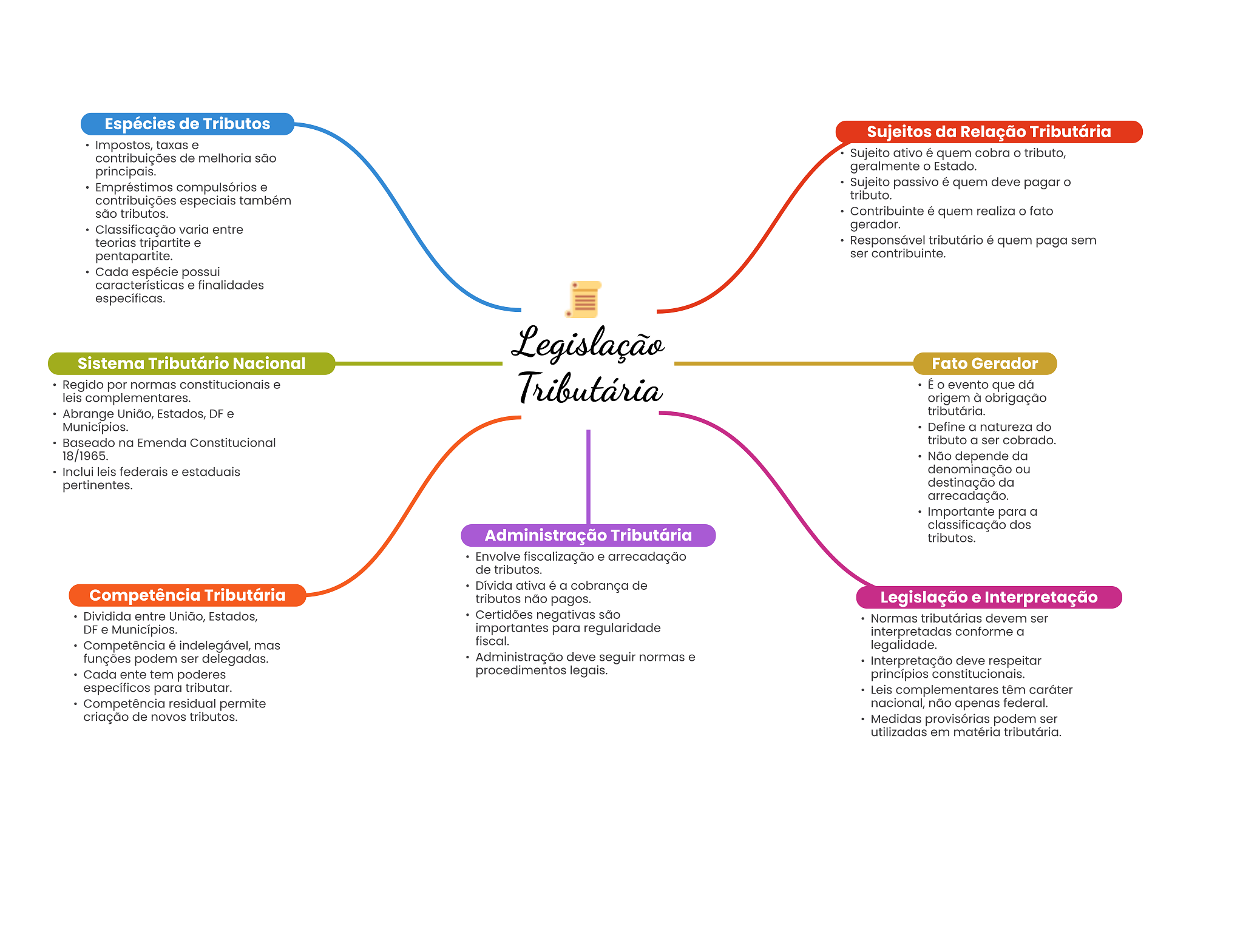 Espécies de Tributos Sujeitos da Relação Tributária Impostos, taxas e contribuições de melhoria são Sujeito ativo é quem cobra tributo, principais. geralmente Estado. Empréstimos compulsórios e Sujeito passivo é quem deve pagar tributo. contribuições especiais também são tributos. Contribuinte é quem realiza fato Classificação varia entre gerador. teorias tripartite e Responsável tributário é quem paga sem pentapartite. ser contribuinte. Cada espécie possui características e finalidades específicas. Legislação Sistema Tributário Nacional Fato Gerador Regido por normas constitucionais e leis complementares. Tributária É O evento que dá origem à obrigação Abrange União, Estados, DF e tributária. Municípios. Define a natureza do Baseado na Emenda Constitucional tributo a ser cobrado. 18/1965. Não depende da Inclui leis federais e estaduais denominação ou pertinentes. destinação da arrecadação. Importante para a classificação dos Administração Tributária tributos. Envolve fiscalização e arrecadação de tributos. Dívida ativa é a cobrança de Competência Tributária tributos não pagos. Legislação e Interpretação Dividida entre União, Estados, Certidões negativas são Normas tributárias devem ser DF e Municípios. importantes para regularidade interpretadas conforme a Competência é indelegável, mas fiscal. legalidade. funções podem ser delegadas. Administração deve seguir normas e Interpretação deve respeitar Cada ente tem poderes procedimentos legais. princípios constitucionais. específicos para tributar. Leis complementares têm caráter Competência residual permite nacional, não apenas federal. criação de novos tributos. Medidas provisórias podem ser utilizadas em matéria tributária.