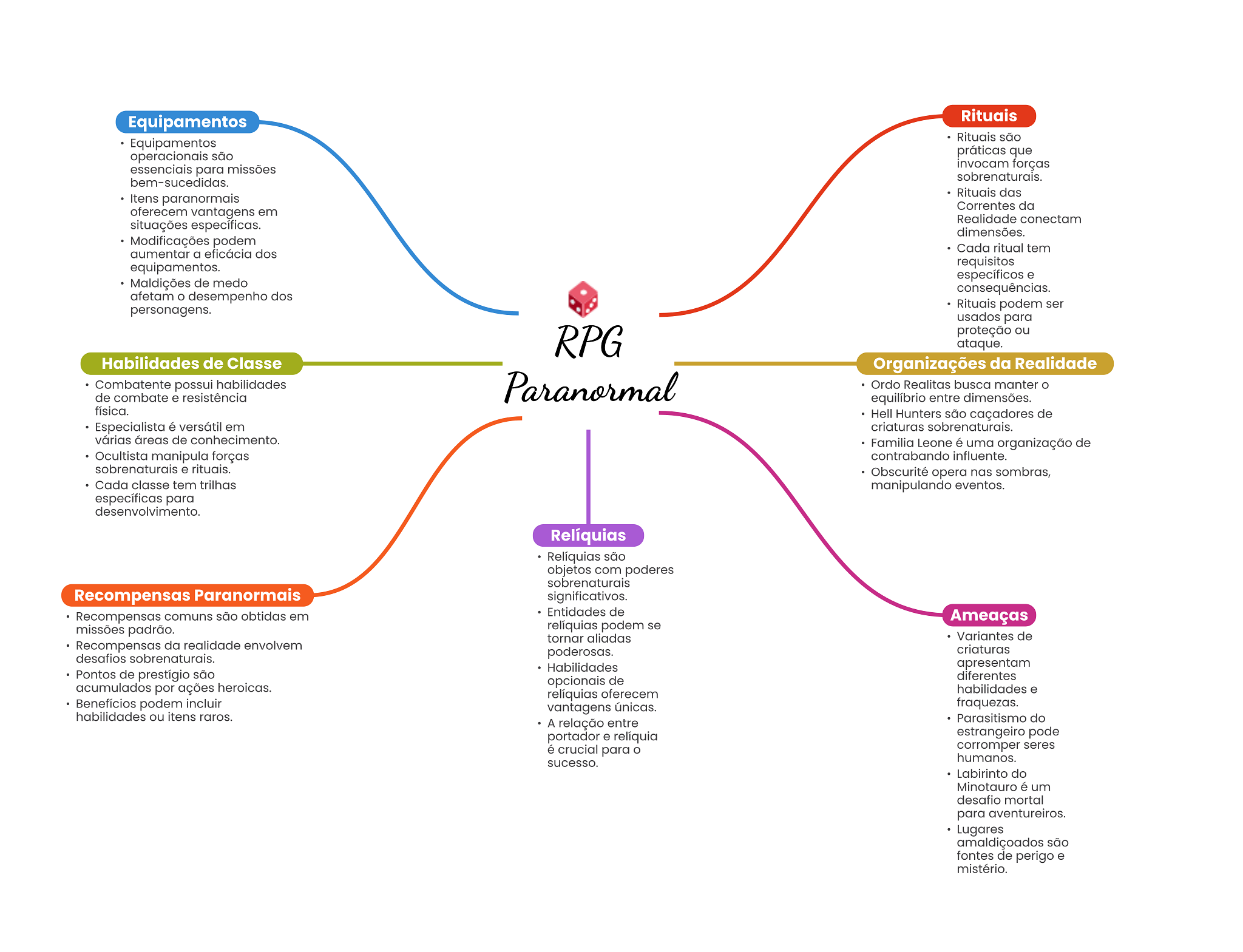 Equipamentos Rituais Rituais são Equipamentos operacionais são práticas que essenciais para missões invocam forças sobrenaturais. bem-sucedidas. Rituais das Itens paranormais Correntes da oferecem vantagens em Realidade conectam situações específicas. dimensões. Modificações podem Cada ritual tem aumentar a eficácia dos equipamentos. requisitos específicos e Maldições de medo consequências. afetam desempenho dos Rituais podem ser personagens. usados para RPG proteção ou ataque. Habilidades de Classe Organizações da Realidade Combatente possui habilidades Paranormal Ordo Realitas busca manter de combate e resistência equilíbrio entre dimensões. física. Hell Hunters são caçadores de Especialista é versátil em criaturas sobrenaturais. várias áreas de conhecimento. Familia Leone é uma organização de Ocultista manipula forças contrabando influente. sobrenaturais e rituais. Obscurité opera nas sombras, Cada classe tem trilhas manipulando eventos. específicas para desenvolvimento. Relíquias Relíquias são objetos com poderes sobrenaturais Recompensas Paranormais significativos. Recompensas comuns são obtidas em Entidades de Ameaças missões padrão. relíquias podem se tornar aliadas Variantes de Recompensas da realidade envolvem desafios sobrenaturais. poderosas. criaturas Habilidades apresentam Pontos de prestígio são opcionais de diferentes acumulados por ações heroicas. relíquias oferecem habilidades e Benefícios podem incluir vantagens únicas. fraquezas. habilidades ou itens raros. A relação entre Parasitismo do portador e relíquia estrangeiro pode é crucial para corromper seres humanos. sucesso. Labirinto do Minotauro é um desafio mortal para aventureiros. Lugares amaldiçoados são fontes de perigo e mistério.