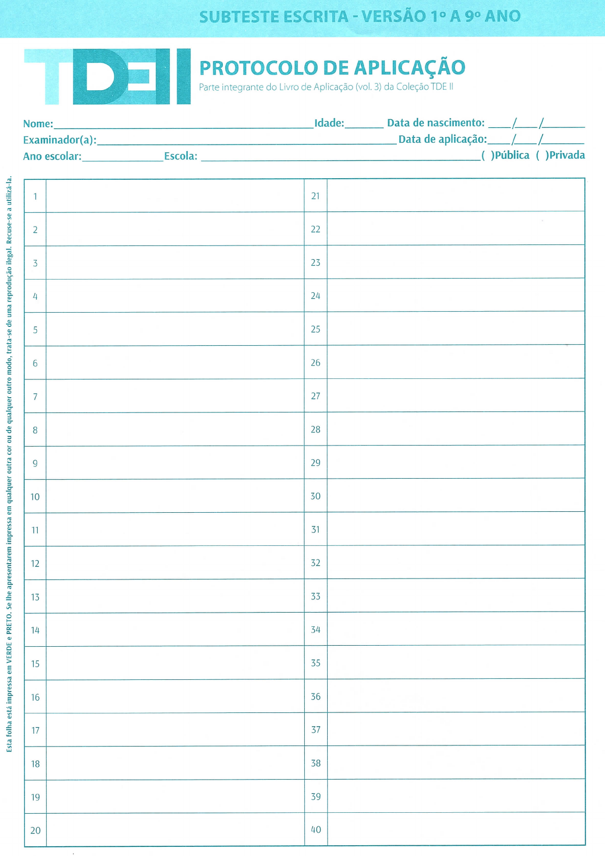 SUBTESTE ESCRITA - VERSÃO 1° A 9° ANO PROTOCOLO DE APLICAÇÃO Parte integrante do Livro de Aplicação (vol. 3) da Coleção TDE Nome: Idade: Data de nascimento: /- Examinador(a): Data de aplicação: Ano escolar: Escola: 1 21 2 22 3 23 4 24 Esta folha está impressa em VERDE e PRETO. Se lhe apresentarem impressa em qualquer outra cor ou de qualquer outro modo, trata-se de uma reprodução ilegal. Recuse-se a utilizá-la. 5 25 6 26 7 27 8 28 9 29 10 30 11 31 12 32 13 33 14 34 15 35 16 36 17 37 18 38 19 39 20 40