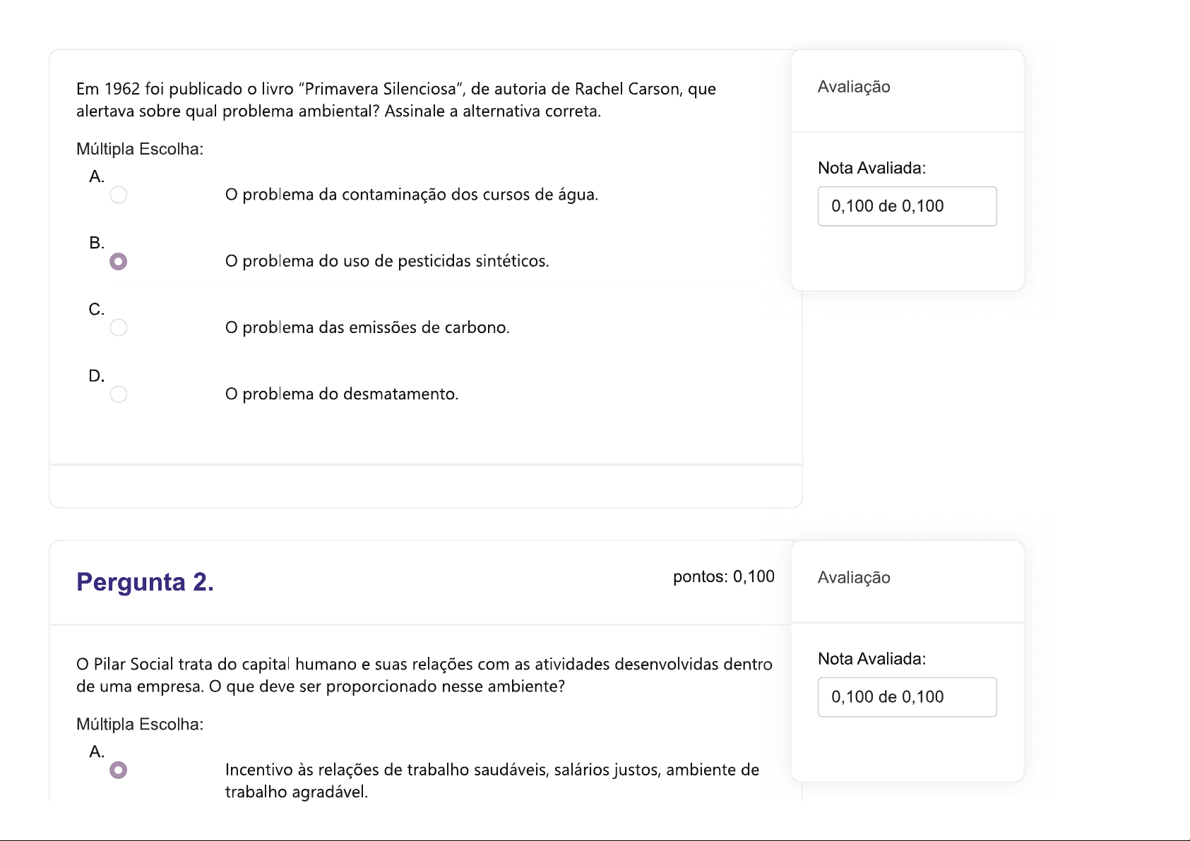 Em 1962 foi publicado livro "Primavera de autoria de Rachel Carson, que Avaliação alertava sobre qual problema ambiental? Assinale a alternativa correta. Múltipla Escolha: Nota Avaliada: O problema da contaminação dos cursos de água. 0,100 de 0,100 O problema do uso de pesticidas sintéticos. C. O problema das emissões de carbono. D. O problema do desmatamento. Pergunta 2. pontos: 0,100 Avaliação Pilar Social trata do capital humano e suas relações com as atividades desenvolvidas dentro Nota Avaliada: de uma empresa. O que deve ser proporcionado nesse ambiente? 0,100 de 0,100 Múltipla Escolha: Incentivo às relações de trabalho saudáveis, salários justos, ambiente de trabalho agradável.B. Salários altos, ambiente de trabalho agradável, incentivo aos movimentos sociais. C. Ambiente de trabalho agradável, interação com a comunidade, salários altos. D. Salários justos, ambiente de trabalho agradável, independência dos movimentos sociais. Pergunta 3. pontos: 0,100 Avaliação Quais são três Pilares do Desenvolvimento Sustentável? Nota Avaliada: Múltipla Escolha: 0,100 de 0,100 Econômico, Social e Cultura B. Social, Ambiental e Cultural C. Social, Ambiental e Patrimonial.D. Econômico, Social e Ambiental. Pergunta 4. pontos: 0,100 Avaliação primeiro conceito de Desenvolvimento Sustentável surgiu em 1983, na Comissão Mundial Nota Avaliada: sobre Meio Ambiente e Desenvolvimento, apresentado pela ex-primeira ministra 0,100 de 0,100 norueguesa e médica Gro Harlem Brundtland em um relatório publicado em 1987. O "Nosso Futuro Comum" trouxe a ideia de desenvolvimento sustentável como sendo: Múltipla Escolha: O desenvolvimento que atenda somente às necessidades futuras. B. O desenvolvimento da indústria mediante reparação de danos ambientais, sem interferência na comunidade ao redor. C. O desenvolvimento que encontra as necessidades atuais sem comprometer a habilidade das futuras gerações de atender suas próprias necessidades.D. O desenvolvimento que encontra as necessidades atuais sem compromisso com as futuras gerações.