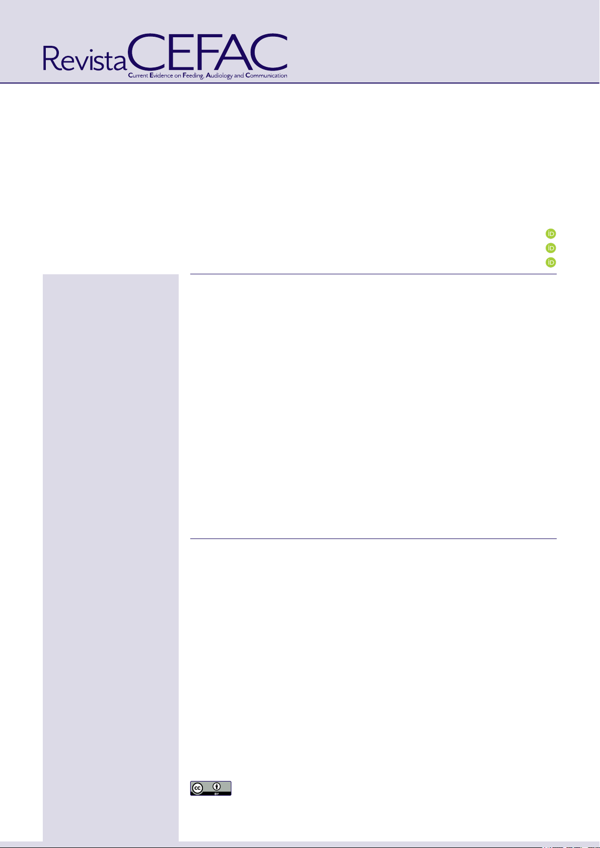 1 Universidade Federal de São Paulo, São Paulo, São Paulo, Brasil. Monitoramento do treinamento auditivo em indivíduos após hematoma subdural crônico: uso de questionários Monitoring auditory training in individuals after chronic subdural hematoma: Use of questionnaires Aline Priscila Cibian1 Cyntia Barbosa Laureano Luiz1 Daniela Gil1 Estudo realizado na Universidade Federal de São Paulo, São Paulo, SP, Brasil. Fonte de financiamento: Nada a declarar Conflito de interesses: Daniela Gil declara que é membro do corpo editorial da Revista CEFAC, mas que não participou do processo de revisão ou da tomada de decisão quanto ao aceite deste artigo Endereço para correspondência: Aline Priscila Cibian Rua Botucatu, 802 - Vila Clementino, CEP: 04023-062 - São Paulo, SP, Brasil E-mail: aline.cibian@gmail.com Recebido em 07/05/2025 Recebido na versão revisada em 09/09/2025 Aceito em 10/10/2925 Editor Chefe: Erissandra Gomes Editor Associado: Denise Costa Menezes RESUMO Objetivo: caracterizar e comparar as respostas aos questionários de autoavaliação em indivíduos pós- tratamento cirúrgico de um Hematoma Subdural Crônico, submetidos ou não a treinamento auditivo acusticamente controlado. Métodos: participaram 13 indivíduos, com idades entre 45 e 64 anos, submetidos à cirurgia de drenagem de hematoma subdural crônico. Sete indivíduos foram submetidos a um programa de Treinamento Auditivo Acusticamente Controlado de nove sessões com duração de 50 minutos cada; e seis indivíduos não realizaram intervenção (grupo sem treinamento). Os questionários, Escala de Funcionamento auditivo e Questionário pós Treinamento Auditivo Formal foram aplicados em três momentos com intervalos de tempo iguais para ambos os grupos. Os testes utilizados foram: Teste de Friedman e Teste de Wilcoxon. Os intervalos de confiança foram construídos com 95% de confiança estatística e foi estabelecido nível de significância de 0,05 (5%). Resultados: na Escala de Funcionamento auditivo, quando comparada a evolução dos momentos, notou-se diminuição das queixas em 11 das 12 questões e no escore total para o grupo com intervenção e 01 questão e escore total para o grupo sem intervenção. No Questionário pós Treinamento Auditivo Formal, notou-se diminuição das queixas em 01 questão e no escore total para o grupo com intervenção e sem intervenção. Conclusões: houve melhora significativa nas respostas aos questionários. Tal melhora foi mais evidente no grupo que realizou a intervenção e na Escala de Funcionamento Auditivo, ao comparar os momentos de aplicação. Os resultados mantiveram-se estáveis no acompanhamento longitudinal. Descritores: Fonoaudiologia; Audição; Transtornos da Audição; Percepção Auditiva; Inquéritos e Questionários; Hematoma Subdural Crônico ABSTRACT Purpose: to characterize and compare the responses to self-assessment questionnaires in individuals after surgical treatment of chronic subdural hematoma, having or not having undergone acoustically controlled auditory training. Methods: the study included 13 individuals, aged 45 to 64 years, who had undergone surgery for drainage of chronic subdural hematoma. Seven of them underwent a nine-session acoustically controlled auditory training program, each session lasting 50 minutes; the other six individuals did not undergo any intervention (no-training group). The questionnaires (Scale of Auditory Behaviors and Post-Formal Auditory Training Questionnaire) were applied to both groups at three different time points with equal intervals. The analysis used the Friedman and Wilcoxon tests. Confidence intervals were constructed with 95% statistical confidence, and the significance level was set at 0.05 (5%). Results: the Scale of Auditory Behaviors verified a decrease in complaints between time points in 11 of the 12 questions and in the total score in the intervention group, and in one question and the total score in the no-intervention group. The Post-Formal Auditory Training Questionnaire showed a decrease in complaints in one question and the total score in both the intervention and non-intervention groups. Conclusions: the responses to the questionnaires improved significantly, which was more evident in the intervention group and in the Scale of Auditory Behaviors, in the comparison between time points. The results remained stable in the longitudinal follow-up. Keywords: Speech-Language Pathology; Hearing; Hearing Disorders; Auditory Perception; Surveys and Questionnaires; Hematoma, Subdural, Chronic 2925 Artigos originais Rev. CEFAC. 2026;28(1):e2925 DOI: 10.1590/1982-0216/20262812925 DOI: 10.1590/1982-0216/20262812925s | Rev. CEFAC. 2026;28(1):e2925 eISSN 1982-0216 1/14 © 2026 Cibian et al. Este é um artigo publicado em acesso aberto (Open Access) sob a licença Creative Commons Attribution, que permite uso, distribuição e reprodução em qualquer meio, sem restrições desde que o trabalho original seja corretamente citado. https://orcid.org/0000-0001-9327-2280 https://orcid.org/0000-0001-9492-8472 https://orcid.org/0000-0002-8647-6813 https://creativecommons.org/licenses/by/4.0/ Rev. CEFAC. 2026;28(1):e2925 | DOI: 10.1590/1982-0216/20262812925s 2/14 | Cibian AP, Luiz CBL, Gil D No entanto, esse tipo de acompanhamento costuma ser aplicado principalmente em crianças em idade escolar8, com o objetivo de aprimorar o desempenho acadêmico, o que explica a escassez de estudos que utilizem questionários de comportamento auditivo em adultos3. O objetivo do trabalho foi caracterizar e comparar as respostas aos questionários de autoavaliação em indivíduos pós tratamento cirúrgico de um HSDC, submetidos ou não a treinamento auditivo acustica- mente controlado. MÉTODOS O projeto foi encaminhado ao Comitê de Ética e Pesquisa da Universidade Federal de São Paulo – Hospital São Paulo - UNIFESP, através da Plataforma Brasil, antes de seu início e aprovado com número 0841/2015 e CAAE nú