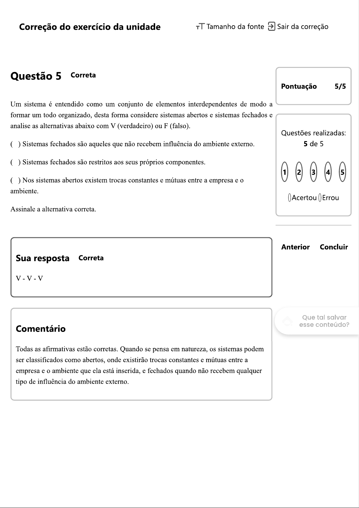 Correção do exercício da unidade TT Tamanho da fonte Sair da correção Questão 5 Correta Pontuação 5/5 Um sistema é entendido como um conjunto de elementos interdependentes de modo a formar um todo organizado, desta forma considere sistemas abertos e sistemas fechados e analise as alternativas abaixo com V (verdadeiro) ou F (falso). Questões realizadas: ( ) Sistemas fechados são aqueles que não recebem influência do ambiente externo. 5 de 5 ( ) Sistemas fechados são restritos aos seus próprios componentes. 1 2 3 4 5 Nos sistemas abertos existem trocas constantes e mútuas entre a empresa e o ambiente. Assinale a alternativa correta. Anterior Concluir Sua resposta Correta V-V-V Que tal salvar esse conteúdo? Comentário Todas as afirmativas estão corretas. Quando se pensa em natureza, os sistemas podem ser classificados como abertos, onde existirão trocas constantes e mútuas entre a empresa e o ambiente que ela está inserida, e fechados quando não recebem qualquer tipo de influência do ambiente externo.