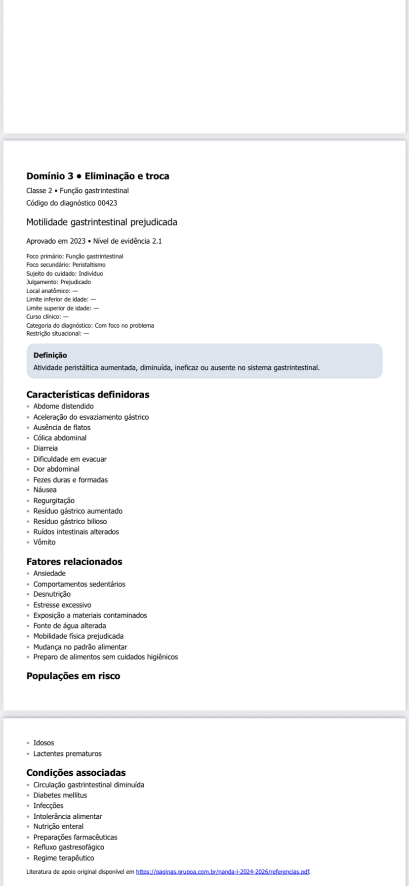 Domínio 3 . Eliminação e troca Classe 2 Função gastrintestinal Código do diagnóstico 00423 Motilidade gastrintestinal prejudicada Aprovado em 2023 de evidência 2.1 Foco primário: Função gastrintestinal Foco secundário: Peristaltismo Sujeito do cuidado: Julgamento: Prejudicado Local anatômico: Limite inferior de idade: Limite superior de idade: Curso clínico: Categoria do diagnóstico: Com foco no problema Restrição situacional: Definição Atividade peristáltica aumentada, diminuída, ineficaz ou ausente no sistema gastrintestinal. Características definidoras Abdome distendido Aceleração do esvaziamento gástrico Ausência de flatos Cólica abdominal Diarreia Dificuldade em evacuar Dor abdominal Fezes duras e formadas Náusea Regurgitação Resíduo gástrico aumentado Resíduo gástrico bilioso Ruídos intestinais alterados Vômito Fatores relacionados Ansiedade Comportamentos sedentários Desnutrição Estresse excessivo Exposição a materiais contaminados Fonte de água alterada Mobilidade física prejudicada Mudança no padrão alimentar Preparo de alimentos sem cuidados higiênicos Populações em risco Idosos Lactentes prematuros Condições associadas Circulação gastrintestinal Diabetes mellitus Infecções Intolerância alimentar Nutrição enteral Preparações farmacêuticas Refluxo gastresofágico Regime terapêutico Literatura de apoio original em