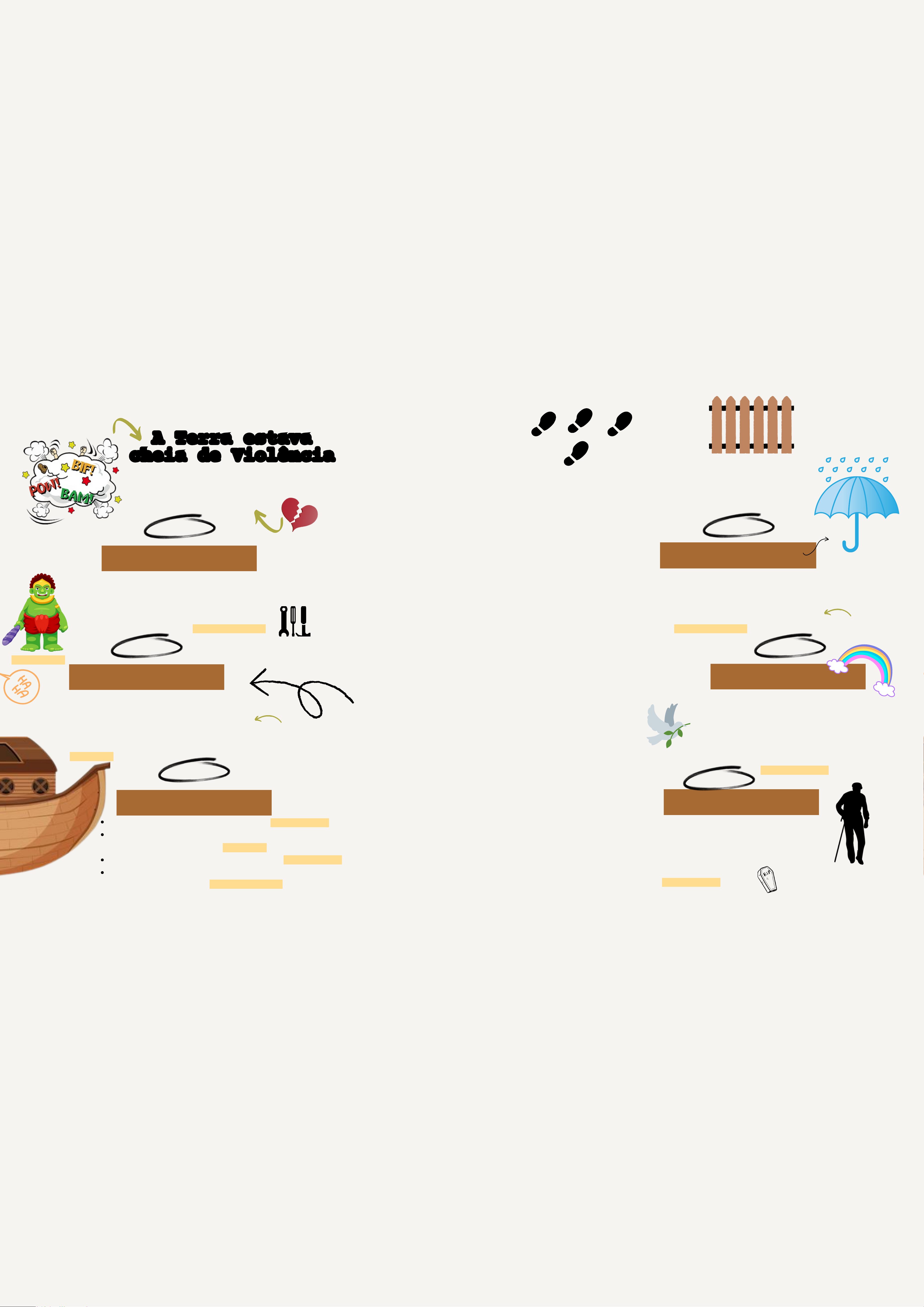 Ele andava COM DEUS 02 O PROJETO Nos dias de Noé, o povo estava muito pecador. Deus achou graça em Noé e o escolheu para construir uma enorme Arca, para que sua família e um casal de cada espécie pudesse se abrigar durante a chuva forte ( dilúvio). 01 03 NOÉ CONSTRUIU A ARCA 06 04 05 Gênesis 6 Noé era apenas um fazendeiro/ agricultor. Cuidava da sua família e vivia tranquilamente. Mas, Deus o chamou para cumprir uma missão. Noé foi obediente e cumpriu a ordem de Deus. Levou 100 anos para construir Mais de 20 mil espécies de animais entraram na ArcaGênesis 7 A Arca flutuava a vontade ( à deriva) A Arca tinha 1/3 do tamanho do Titanic Depois que todos estavam dentro da Arca, Noé e sua família e também os animais, a chuva começou a cair. E choveu, choveu... A Arca balançava pra lá e pra cá nas águas. Após sair da Arca, Noé recomeçou com sua família. Plantou uma vinha. Infelizmente o pecado recomeçou. Noé viveu, mais 350 anos após o dilúvio e morreu. Após 40 dias de muita chuva, finalmente ao soltar uma pomba ( já pela segunda vez), ela não voltou mais. Noé entendeu que era o momento de todos saírem. Para recomeçar, Deus colocou um Arco-íris no céu, como sinal que não haveria mais o dilúvio. Gênesis 8 ao 9 O DILÚVIO N O É A Terra estava cheia de Violência HAVIA GIGANTES NA TERRA Noé tinha No tempo de Moisés, o povo era tão pecador, que o coração de Deus ficou entristecido. Era Fazendeiro Noé viveu muito 950 anos 500ANOS 40 dias 40 noites Noé tinha 600anos DEUS O CHAMOU FIM DA VIDA A ALIANÇA Gênesis 6.9 Gênesis 6.4 Gênesis 6.13-19 Gênesis 6.14-16 Gênesis 5.32 Gênesis 7.17 Gênesis 9.20 Gênesis 7.10-12 ificaSeu nome sign "DESCANSO" / "REPOUSO" ESPECIAL FIEL SÁBIO JUSTO INTELIGENTE CORAJOSO CHEIO DE AMOR