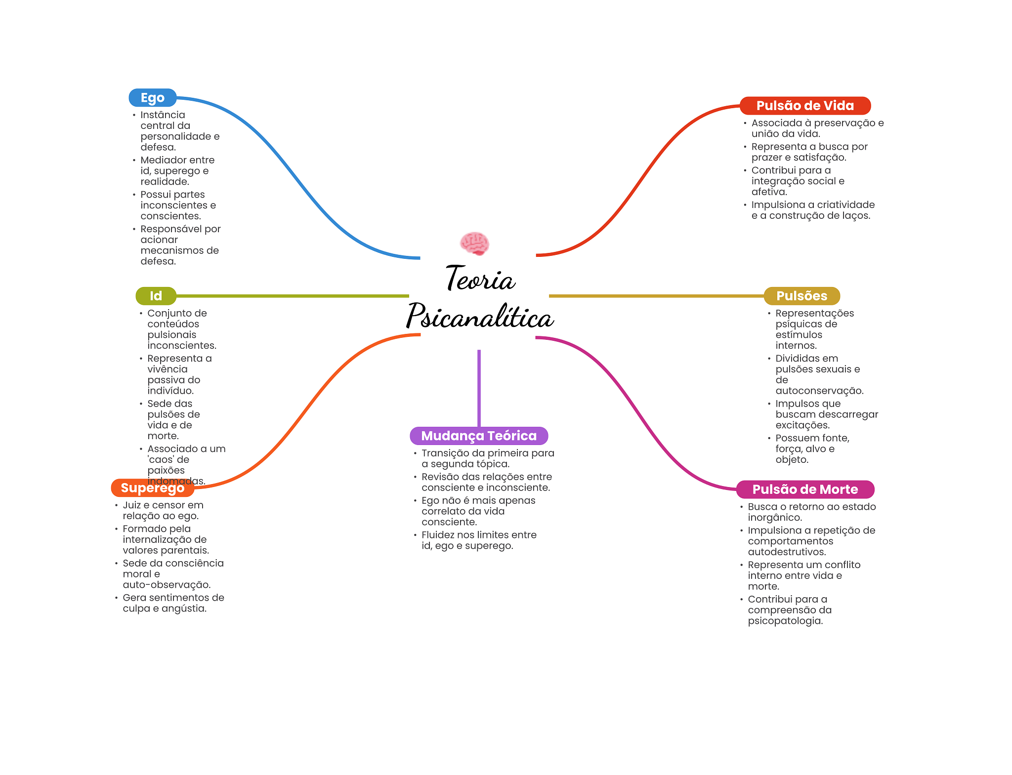Ego Pulsão de Vida Instância central da Associada à preservação e personalidade e união da vida. defesa. Representa a busca por Mediador entre prazer e satisfação. id, superego e Contribui para a realidade. integração social e Possui partes afetiva. inconscientes e Impulsiona a criatividade conscientes. e a construção de laços. Responsável por acionar mecanismos de defesa. Teoria Id Pulsões Conjunto de conteúdos Representações psíquicas de pulsionais estímulos inconscientes. internos. Representa a Divididas em vivência pulsões sexuais e passiva do de indivíduo. autoconservação. Sede das Impulsos que pulsões de buscam descarregar vida e de excitações. morte. Mudança Teórica Possuem fonte, Associado a um Transição da primeira para força, alvo e 'caos' de a segunda tópica. objeto. paixões indomadas. Revisão das relações entre Superego consciente e inconsciente. Pulsão de Morte Juiz e censor em Ego não é mais apenas correlato da vida Busca retorno ao estado relação ao ego. consciente. inorgânico. Formado pela Fluidez nos limites entre Impulsiona a repetição de internalização de valores parentais. id, ego e superego. comportamentos autodestrutivos. Sede da consciência Representa um conflito moral e interno entre vida e auto-observação. morte. Gera sentimentos de Contribui para a culpa e angústia. compreensão da psicopatologia.