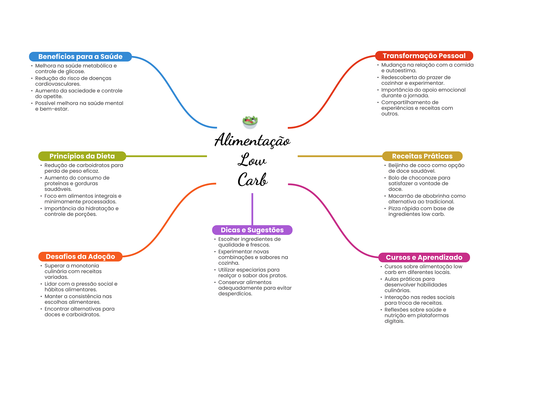 Benefícios para a Saúde Transformação Pessoal Melhora na saúde metabólica e Mudança na relação com a comida controle de glicose. e autoestima. Redução do risco de doenças Redescoberta do prazer de cozinhar e experimentar. Aumento da saciedade e controle Importância do apoio emocional do apetite. durante a jornada. Possível melhora na saúde mental Compartilhamento de e bem-estar. experiências e receitas com outros. Alimentação Princípios da Dieta Low Receitas Práticas Redução de carboidratos para Beijinho de COCO como opção perda de peso eficaz. de doce saudável. Aumento do consumo de Carb Bolo de choconoze para proteínas e gorduras satisfazer a vontade de saudáveis. doce. Foco em alimentos integrais e Macarrão de abobrinha como minimamente processados. alternativa ao tradicional. Importância da hidratação e Pizza rápida com base de controle de porções. ingredientes low carb. Dicas e Sugestões Escolher ingredientes de qualidade e frescos. Experimentar novas Desafios da Adoção combinações e sabores na Cursos e Aprendizado cozinha. Superar a monotonia Cursos sobre alimentação low culinária com receitas Utilizar especiarias para carb em diferentes locais. variadas. realçar O sabor dos pratos. Aulas práticas para Lidar com a pressão social e Conservar alimentos desenvolver habilidades hábitos alimentares. adequadamente para evitar culinárias. Manter a consistência nas desperdícios. Interação nas redes sociais escolhas alimentares. para troca de receitas. Encontrar alternativas para Reflexões sobre saúde e doces e carboidratos. nutrição em plataformas digitais.
