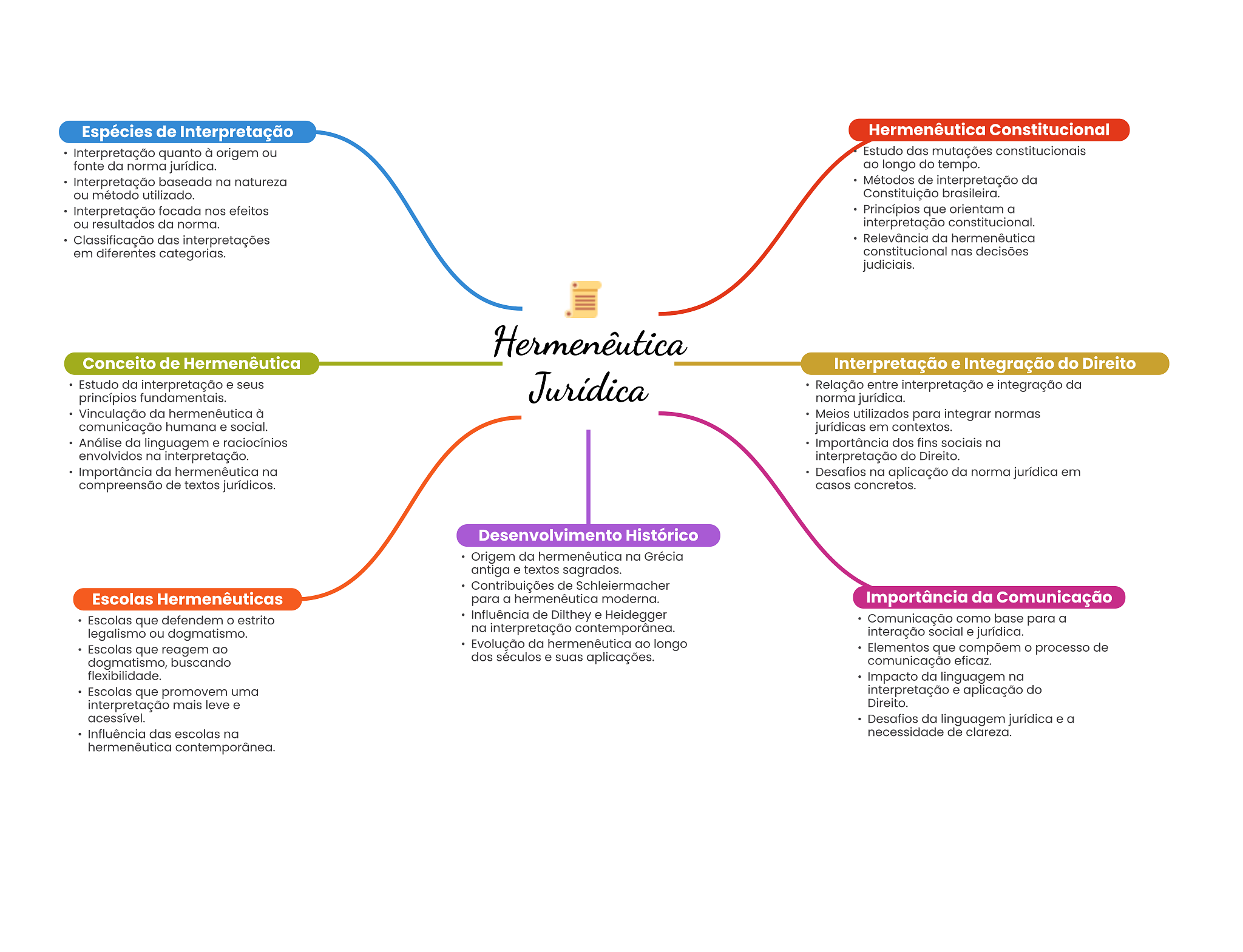 Espécies de Interpretação Hermenêutica Constitucional Interpretação quanto à origem ou Estudo das mutações constitucionais fonte da norma jurídica. ao longo do tempo. Interpretação baseada na natureza Métodos de interpretação da ou método utilizado. Constituição brasileira. Interpretação focada nos efeitos Princípios que orientam a ou resultados da norma. interpretação constitucional. Classificação das interpretações Relevância da hermenêutica em diferentes categorias. constitucional nas decisões judiciais. Hermenêutica Conceito de Hermenêutica Interpretação e Integração do Direito Estudo da interpretação e seus Jurídica Relação entre interpretação e integração da princípios fundamentais. norma jurídica. Vinculação da hermenêutica à Meios utilizados para integrar normas comunicação humana e social. jurídicas em contextos. Análise da linguagem e raciocínios Importância dos fins sociais na envolvidos na interpretação. interpretação do Direito. Importância da hermenêutica na Desafios na aplicação da norma jurídica em compreensão de textos jurídicos. casos concretos. Desenvolvimento Histórico Origem da hermenêutica na Grécia antiga e textos sagrados. Contribuições de Schleiermacher Escolas Hermenêuticas para a hermenêutica moderna. Importância da Comunicação Escolas que defendem estrito Influência de Dilthey e Heidegger Comunicação como base para a legalismo ou dogmatismo. na interpretação contemporânea. interação social e jurídica. Escolas que reagem ao Evolução da hermenêutica ao longo Elementos que compõem O processo de dogmatismo, buscando dos séculos e suas aplicações. comunicação eficaz. flexibilidade. Impacto da linguagem na Escolas que promovem uma interpretação e aplicação do interpretação mais leve e Direito. acessível. Desafios da linguagem jurídica e a Influência das escolas na necessidade de clareza. hermenêutica contemporânea.