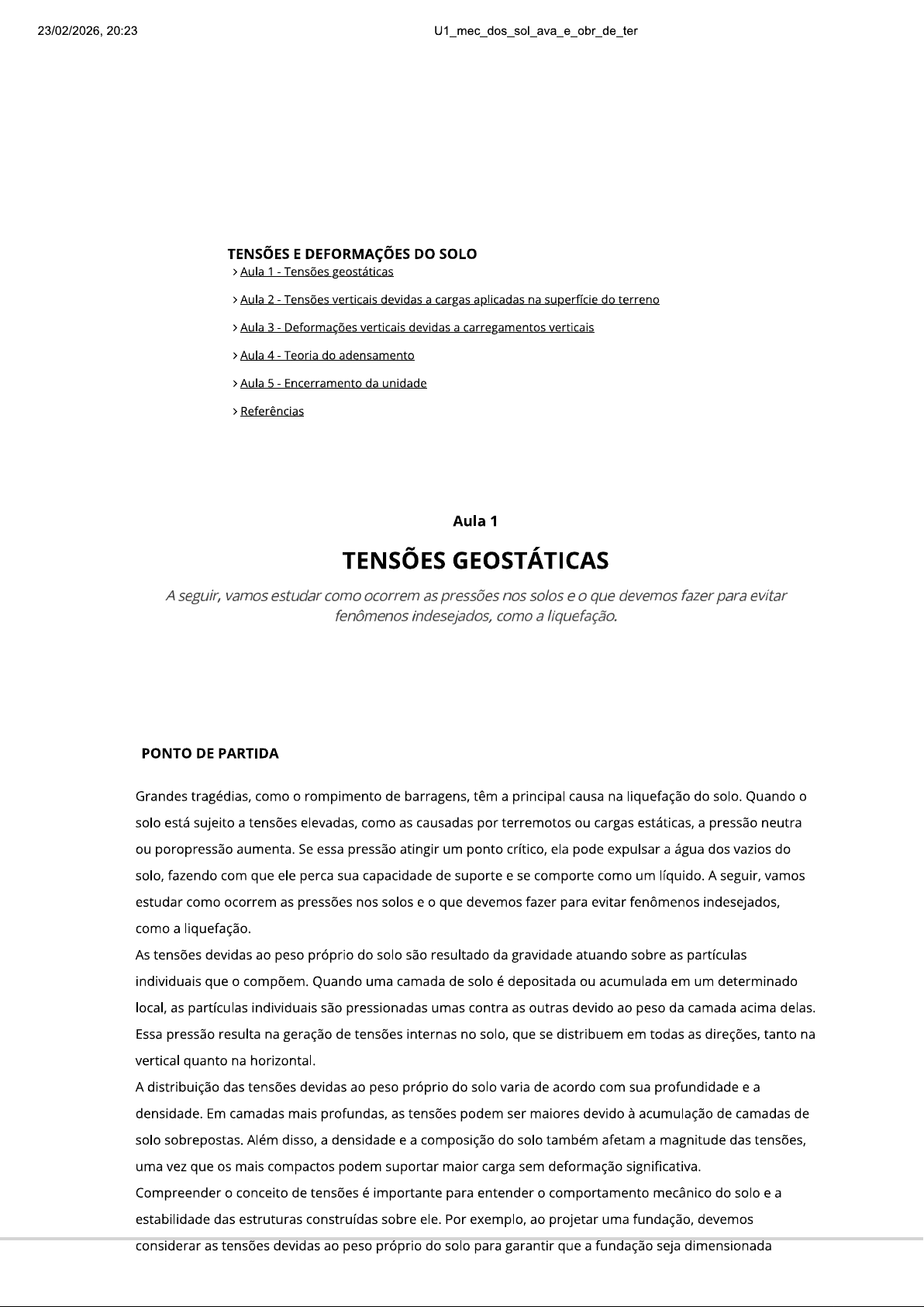 23/02/2026, 20:23 TENSÕES E DEFORMAÇÕES DO SOLO Aula 1 Aula 2 Tensões verticais devidas a cargas aplicadas na superfície do terreno Aula 3 - Deformações verticais devidas a carregamentos verticais Aula 4 - Teoria do adensamento Aula 5 - Encerramento da unidade Referências Aula 1 TENSÕES GEOSTÁTICAS A seguir, vamos estudar como ocorrem as pressões nos solos e que devemos fazer para evitar fenômenos indesejados, como a liquefação. PONTO DE PARTIDA Grandes tragédias, como o rompimento de barragens, têm a principal causa na liquefação do solo. Quando o solo está sujeito a tensões elevadas, como as causadas por terremotos ou cargas estáticas, a pressão neutra ou poropressão aumenta. Se essa pressão atingir um ponto crítico, ela pode expulsar a água dos vazios do solo, fazendo com que ele perca sua capacidade de suporte e se comporte como um líquido. A seguir, vamos estudar como ocorrem as pressões nos solos e que devemos fazer para evitar fenômenos indesejados, como a liquefação. As tensões devidas ao peso próprio do solo são resultado da gravidade atuando sobre as partículas individuais que o compõem. Quando uma camada de solo é depositada ou acumulada em um determinado local, as partículas individuais são pressionadas umas contra as outras devido ao peso da camada acima delas. Essa pressão resulta na geração de tensões internas no solo, que se distribuem em todas as direções, tanto na vertical quanto na horizontal. A distribuição das tensões devidas ao peso próprio do solo varia de acordo com sua profundidade e a densidade. Em camadas mais profundas, as tensões podem ser maiores devido à acumulação de camadas de solo sobrepostas. Além disso, a densidade e a composição do solo também afetam a magnitude das tensões, uma vez que os mais compactos podem suportar maior carga sem deformação significativa. Compreender conceito de tensões é importante para entender comportamento mecânico do solo e a estabilidade das estruturas construídas sobre ele. Por exemplo, ao projetar uma fundação, devemos considerar as tensões devidas ao peso próprio do solo para garantir que a fundação seja dimensionada23/02/2026, 20:23 U1_mec_dos_sol_ava_e_obr_de_ter adequadamente para suportar essas cargas sem falhas. Da mesma forma, ao construir uma estrutura acima do solo, as tensões do solo influenciam as cargas que essa estrutura precisa suportar e podem afetar sua estabilidade ao longo do tempo. A pressão neutra, também conhecida como poropressão, descreve a distribuição de pressão dentro de uma massa de solo saturado. Quando um solo está saturado, os espaços entre as suas partículas são preenchidos com água. Como resultado, há uma pressão hidrostática exercida pela água, que preenche esses espaços. A pressão neutra ocorre em um ponto específico dentro do solo, onde a pressão hidrostática da água se iguala à pressão efetiva exercida pelas partículas de solo sobre a água. Nesse ponto, não há movimento de água e a estrutura do solo permanece estável. Devemos analisar a poropressão para garantir a estabilidade de estruturas, especialmente em obras e terra e fundações. Ela influencia a capacidade de suporte do solo e a distribuição de cargas sobre as estruturas construídas sobre ele. As tensões efetivas no solo descrevem as forças atuantes entre suas partículas, que são responsáveis pela sua resistência e comportamento mecânico. Elas são calculadas subtraindo a pressão neutra (ou poropressão) das pressões totais atuantes em um determinado ponto dentro do solo. Em outras palavras, as tensões efetivas representam a parte das forças aplicadas que são transmitidas entre as partículas sólidas do solo, excluindo as forças devidas à pressão da água nos vazios do solo. princípio das tensões efetivas, formulado por Terzaghi e Peck (1948), estabelece que a resistência do solo é governada pelas tensões efetivas, não pelas totais. Esse é princípio básico para entender o comportamento do solo sob diferentes condições de carregamento e drenagem. As tensões horizontais no solo referem-se às forças exercidas horizontalmente sobre suas partículas. Elas podem ser causadas por uma variedade de fatores, incluindo a aplicação de cargas externas, movimentação do solo, mudanças no nível de água subterrânea e variações na temperatura. Essas tensões horizontais são particularmente importantes em muitas situações geotécnicas, como no dimensionamento de estruturas de contenção, como muros de arrimo e cortinas de estacas. Em taludes naturais ou artificiais, as tensões horizontais são um fator determinante para a estabilidade do solo, pois podem causar deslizamentos ou colapsos se não forem adequadamente consideradas. Além disso, as tensões horizontais podem afetar a estabilidade de estruturas adjacentes, como edifícios e pontes. Portanto, durante o projeto e construção de qualquer infraestrutura, deve-se avaliar e considerar as tensões horizontais para garantir a segurança e a estabilidade da estrutura e do solo circundante. Vamos conhecer João, um engenheiro civil recém-formado que está trabalhando em um projeto de construção de uma barragem. Ele precisa garantir a estabilidade do talude da barragem e, para isso, deve calcular as tensões efetivas no solo em diferentes profundidades. João está analisando o perfil do solo revelado por uma sondagem. A Figura 4 mostra que nível da água está alinhado com a superfície do terreno. Ele precisa calcular as tensões no solo em diferentes cotas para garantir que a barragem será segura. Como poderá realizar esses cálculos? Quais são as equações necessárias? A compreensão das tensões horizontais no solo é fundamental para os engenheiros geotécnicos e civis, pois permite a tomada de decisões informadas durante projeto, construção e manutenção de obras civis, contribuindo para a segurança e a integridade das estruturas