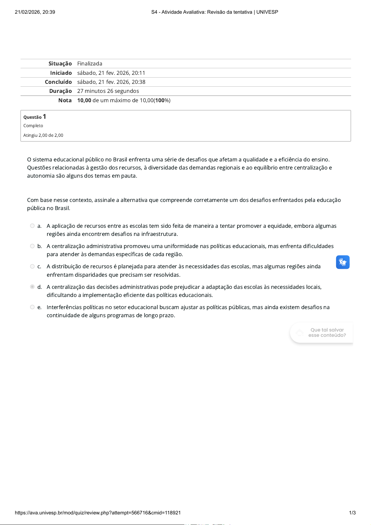 Situação Finalizada Iniciado sábado, 21 fev. 2026, 20:11 Concluído sábado, 21 fev. 2026, 20:38 Duração 27 minutos 26 segundos Nota 10,00 de um máximo de 10,00(100%) Questão 1 Completo Atingiu 2,00 de 2,00 O sistema educacional público no Brasil enfrenta uma série de desafios que afetam a qualidade e a eficiência do ensino. Questões relacionadas à gestão dos recursos, à diversidade das demandas regionais e ao equilíbrio entre centralização e autonomia são alguns dos temas em pauta. Com base nesse contexto, assinale a alternativa que compreende corretamente um dos desafios enfrentados pela educação pública no Brasil. a. A aplicação de recursos entre as escolas tem sido feita de maneira a tentar promover a equidade, embora algumas regiões ainda encontrem desafios na infraestrutura. b. A centralização administrativa promoveu uma uniformidade nas políticas educacionais, mas enfrenta dificuldades para atender às demandas específicas de cada região. c. A distribuição de recursos é planejada para atender às necessidades das escolas, mas algumas regiões ainda enfrentam disparidades que precisam ser resolvidas. d. A centralização das decisões administrativas pode prejudicar a adaptação das escolas às necessidades locais, dificultando a implementação eficiente das políticas educacionais. e. Interferências políticas no setor educacional buscam ajustar as políticas públicas, mas ainda existem desafios na continuidade de alguns programas de longo prazo. Que tal salvar esse conteúdo? 21/02/2026, 20:39 S4 - Atividade Avaliativa: Revisão da tentativa | UNIVESP https://ava.univesp.br/mod/quiz/review.php?attempt=566716&cmid=118921 1/3 Questão 2 Completo Atingiu 2,00 de 2,00 Questão 3 Completo Atingiu 2,00 de 2,00 De acordo com Almeida (1998), no Estado Novo, houve um discurso que privilegiava a educação como uma espécie de estratégia do governo para erradicar focos de resistência à ideologia autoritária do período. Esse viés foi percebido, inclusive, tanto na imprensa secular quanto na religiosa. ALMEIDA, M. das G. A. A. de. Estado Novo: Projeto Político-Pedagógico e a construção do saber. Revista Brasileira de História,[s. l.], v. 18, n. 36, 1998. Disponível em: https://www.scielo.br/j/rbh/a/NwtqF73gWsGpHq7vR4PhGtN/?lang=pt. Acesso em: 3 out. 2022. Considerando o fragmento acima, de Almeida (1998), assinale a alternativa que indica corretamente a expectativa em torno da educação alinhada ao Estado Novo. a. A educação era entendida como uma ciência obsoleta e, até mesmo, desnecessária na sociedade da época. b. Não se compreendia a educação de forma instrumental, ou seja, como um mecanismo que preparava as pessoas para a vida profissional. c. A educação era vista como desnecessária por fomentar ideias contrárias ao Estado. d. A educação era entendida como um instrumento ideológico do Estado. e. Na educação residia a noção de que o Estado Novo era antagônico a um regime de governo autoritário. Circe Bittencourt (2008, p. 23) afirma que“a origem do livro didático está vinculada ao poder instituído. A articulação entre a produção didática e o nascimento do sistema educacional estabelecido pelo Estado distingue essa produção cultural dos demais livros, nos quais há menor nitidez da interferência de agentes externos em sua elaboração”. Em alguns momentos da história, principalmente durante regimes autoritários, a intervenção do Estado na produção de livros escolares se fez de modo mais claro e contundente, o que ocorreu durante o Estado Novo, conforme o texto de Maria das Graças Almeida. Segundo a autora, “o livro didático foi motivo de grande atenção por parte dos políticos que faziam parte da administração estadonovista”. Identifique a opção que sintetiza a visão dos agentes estadonovistas sobre a importância e os objetivos dos livros escolares: a. Os livros escolares eram vistos como “armas brancas” muito importantes para a difusão das ideias bolchevistas, defendidas pelos agentes do Estado Novo. b. Os livros escolares deveriam ser usados em favor de interesses do Estado, como instrumentos de uma leitura doutrinária, capaz de instruir contra o comunismo. c. Os livros escolares eram vistos como importantes instrumentos para a difusão da cultura e a arte. d. Os livros escolares não eram considerados como importantes para a difusão de ideologias. e. Os livros escolares eram vistos, pelo Estado Novo, como materiais escolares neutros, sem conteúdo ideológico. Que tal salvar esse conteúdo? 21/02/2026, 20:39 S4 - Atividade Avaliativa: Revisão da tentativa | UNIVESP https://ava.univesp.br/mod/quiz/review.php?attempt=566716&cmid=118921 2/3 https://www.scielo.br/j/rbh/a/NwtqF73gWsGpHq7vR4PhGtN/?lang=pt Questão 4 Completo Atingiu 2,00 de 2,00 Questão 5 Completo Atingiu 2,00 de 2,00 Um fato curioso ocorrido no período do Estado Novo, em Pernambuco, foi a realização de uma espécie de campanha doutrinária a respeito da relação que se estabelecia entre ensino versus a assim chamada “regeneração política de Pernambuco”. Esse ideário era reproduzido pelo ___________, periódico que fazia apologia ao __________, regime de governo alemão. Assinale a alternativa que preenche as lacunas anteriores corretamente. a. Jornal Folha da Manhã - III Reich. b. Jornal Folha da Manhã - Governo. c. Governo - Estado de Pernambuco. d. Jornal Folha da Manhã - Estado Novo. e. III Reich - Estado Novo. No contexto da educação brasileira durante o período imperial, ocorreram várias transformações sociais e econômicas que influenciaram diretamente o sistema educacional. Essas mudanças foram marcadas pela expansão da cafeicultura, a urbanização e industrialização crescentes. Além disso, o ensino secundário começou a sofrer alterações significativas para atender às novas demandas da sociedade em transformação. Identifique a alternativa correta sobre uma das mudanças 