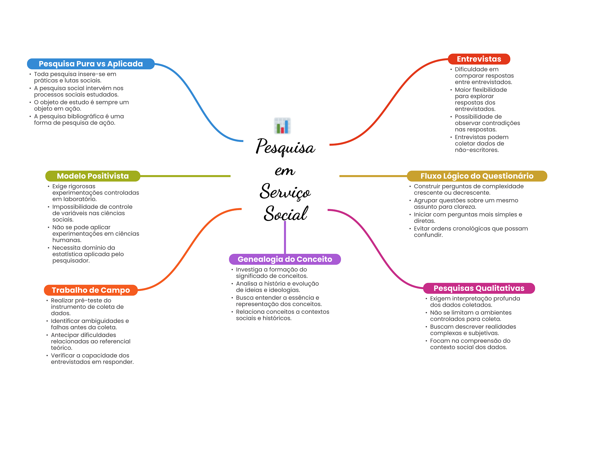 Entrevistas Pesquisa Pura vs Aplicada Dificuldade em Toda pesquisa insere-se em comparar respostas práticas e lutas sociais. entre entrevistados. A pesquisa social intervém nos Maior flexibilidade processos sociais estudados. para explorar objeto de estudo é sempre um respostas dos objeto em ação. entrevistados. A pesquisa bibliográfica é uma Possibilidade de forma de pesquisa de ação. observar contradições nas respostas. Entrevistas podem Pesquisa coletar dados de não-escritores. em Modelo Positivista Fluxo Lógico do Questionário Exige rigorosas em laboratório. Serviço Construir perguntas de complexidade experimentações controladas crescente ou decrescente. Agrupar questões sobre um mesmo Impossibilidade de controle de variáveis nas ciências Social assunto para clareza. Iniciar com perguntas mais simples e sociais. diretas. Não se pode aplicar Evitar ordens cronológicas que possam experimentações em ciências confundir. humanas. Necessita domínio da estatística aplicada pelo pesquisador. Genealogia do Conceito Investiga a formação do significado de conceitos. Analisa a história e evolução Trabalho de Campo de ideias e ideologias. Pesquisas Qualitativas Busca entender a essência e Realizar pré-teste do Exigem interpretação profunda instrumento de coleta de representação dos conceitos. dos dados coletados. dados. Relaciona conceitos a contextos Não se limitam a ambientes sociais e históricos. Identificar ambiguidades e controlados para coleta. falhas antes da coleta. Buscam descrever realidades Antecipar dificuldades complexas e subjetivas. relacionadas ao referencial Focam na compreensão do teórico. contexto social dos dados. Verificar a capacidade dos entrevistados em responder.