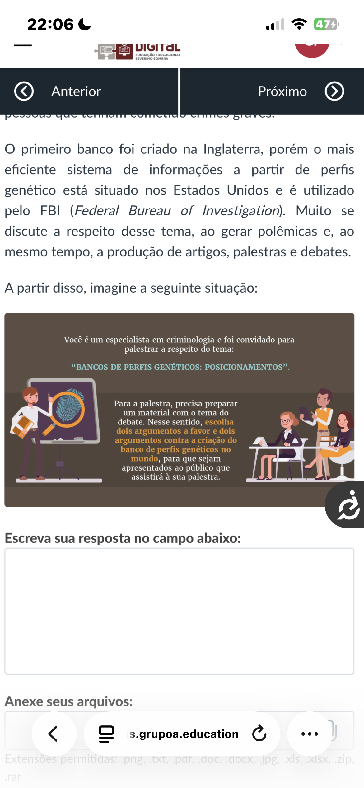22:06 474 DIGITAL FUNDAÇÃO EDUCACIONAL SEVERINO SOMBRA Anterior Próximo que primeiro banco foi criado na Inglaterra, porém mais eficiente sistema de informações a partir de perfis genético está situado nos Estados Unidos e é utilizado pelo FBI (Federal Bureau of Investigation). Muito se discute a respeito desse tema, ao gerar polêmicas e, ao mesmo tempo, a produção de artigos, palestras e debates. A partir disso, imagine a seguinte situação: Você é um especialista em criminologia e foi convidado para palestrar a respeito do tema: "BANCOS DE PERFIS GENÉTICOS: POSICIONAMENTOS" Para a palestra, precisa preparar um material com tema do debate. Nesse sentido, escolha dois argumentos a favor e dois argumentos contra a criação do banco de perfis genéticos no mundo, para que sejam apresentados ao público que assistirá à sua palestra. Escreva sua resposta no campo abaixo: Anexe seus arquivos: Oli s.grupoa.education Extensões permitidas: .png, .txt, .doc, .docx, .xls, .zip, .rar