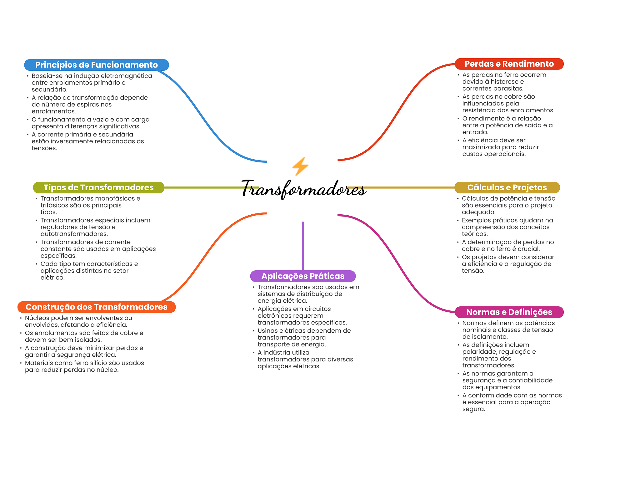 Princípios de Funcionamento Perdas e Rendimento Baseia-se na indução eletromagnética As perdas no ferro ocorrem entre enrolamentos primário e devido à histerese e secundário. correntes parasitas. A relação de transformação depende As perdas no cobre são do número de espiras nos influenciadas pela enrolamentos. resistência dos enrolamentos. funcionamento a vazio e com carga rendimento é a relação apresenta diferenças significativas. entre a potência de saída e a A corrente primária e secundária entrada. estão inversamente relacionadas às A eficiência deve ser tensões. maximizada para reduzir custos operacionais. Tipos de Transformadores Transformadores Cálculos e Projetos Transformadores monofásicos e Cálculos de potência e tensão trifásicos são principais são essenciais para projeto tipos. adequado. Transformadores especiais incluem Exemplos práticos ajudam na reguladores de tensão e compreensão dos conceitos autotransformadores. teóricos. Transformadores de corrente A determinação de perdas no constante são usados em aplicações cobre e no ferro é crucial. específicas. Os projetos devem considerar Cada tipo tem características e a eficiência e a regulação de aplicações distintas no setor tensão. elétrico. Aplicações Práticas Transformadores são usados em sistemas de distribuição de energia elétrica. Construção dos Transformadores Aplicações em circuitos Núcleos podem ser envolventes ou eletrônicos requerem Normas e Definições envolvidos, afetando a eficiência. transformadores específicos. Normas definem as potências Os enrolamentos são feitos de cobre e Usinas elétricas dependem de nominais e classes de tensão transformadores para de isolamento. devem ser bem isolados. A construção deve minimizar perdas e transporte de energia. As definições incluem garantir a segurança elétrica. A indústria utiliza polaridade, regulação e Materiais como ferro silício são usados transformadores para diversas rendimento dos para reduzir perdas no núcleo. aplicações elétricas. transformadores. As normas garantem a segurança e a confiabilidade dos equipamentos. A conformidade com as normas é essencial para a operação segura.