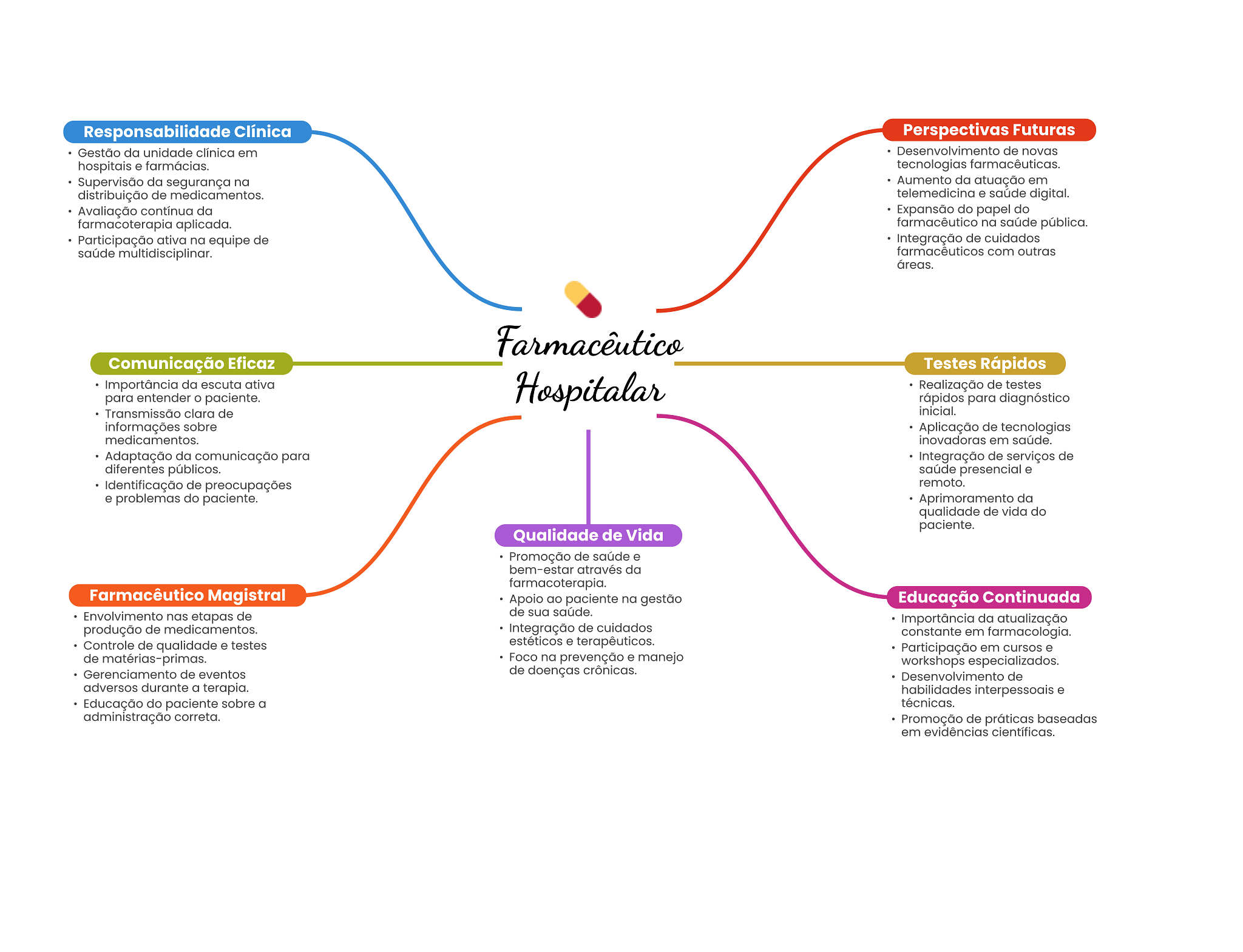 Responsabilidade Clínica Perspectivas Futuras Gestão da unidade clínica em Desenvolvimento de novas hospitais e farmácias. tecnologias farmacêuticas. Supervisão da segurança na Aumento da atuação em distribuição de medicamentos. telemedicina e saúde digital. Avaliação contínua da Expansão do papel do farmacoterapia aplicada. farmacêutico na saúde pública. Participação ativa na equipe de Integração de cuidados saúde multidisciplinar. farmacêuticos com outras áreas. Farmacêutico Comunicação Eficaz Testes Rápidos Importância da escuta ativa para entender paciente. Hospitalar Realização de testes rápidos para diagnóstico Transmissão clara de inicial. informações sobre Aplicação de tecnologias medicamentos. inovadoras em saúde. Adaptação da comunicação para Integração de serviços de diferentes públicos. saúde presencial e Identificação de preocupações remoto. e problemas do paciente. Aprimoramento da qualidade de vida do paciente. Qualidade de Vida Promoção de saúde e bem-estar através da farmacoterapia. Farmacêutico Magistral Apoio ao paciente na gestão Educação Continuada Envolvimento nas etapas de de sua saúde. Importância da atualização produção de medicamentos. Integração de cuidados constante em farmacologia. Controle de qualidade e testes estéticos e terapêuticos. Participação em cursos e de matérias-primas. Foco na prevenção e manejo workshops especializados. Gerenciamento de eventos de doenças crônicas. de adversos durante a terapia. habilidades interpessoais e Educação do paciente sobre a técnicas. administração correta. Promoção de práticas baseadas em evidências científicas.