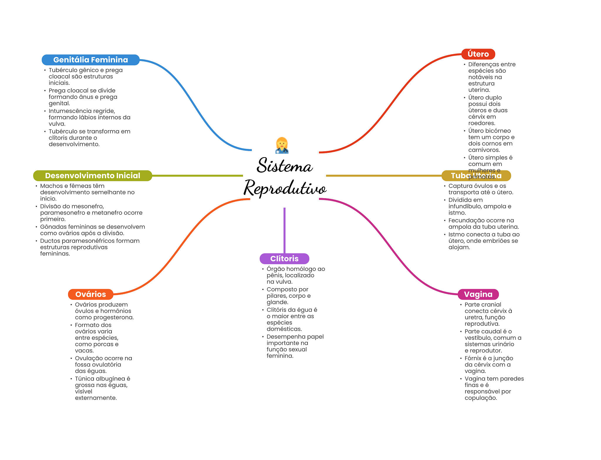 Útero Genitália Feminina Diferenças entre Tubérculo gênico e prega espécies são cloacal são estruturas notáveis na iniciais. estrutura Prega cloacal se divide uterina. formando ânus e prega Útero duplo genital. possui dois Intumescência regride, úteros e duas formando lábios internos da cérvix em vulva. roedores. Tubérculo se transforma em Útero bicórneo clítoris durante tem um corpo e desenvolvimento. dois cornos em carnívoros. Útero simples é Sistema comum em mulheres e Desenvolvimento Inicial Machos e fêmeas têm desenvolvimento semelhante no Reprodutivo Captura óvulos e transporta até útero. início. Dividida em Divisão do mesonefro, infundíbulo, ampola e paramesonefro e metanefro ocorre istmo. primeiro. Fecundação ocorre na Gônadas femininas se desenvolvem ampola da tuba uterina. como ovários após a divisão. Istmo conecta a tuba ao Ductos paramesonéfricos formam útero, onde embriões se estruturas reprodutivas alojam. femininas. Clítoris Órgão homólogo ao pênis, localizado na vulva. Composto por Ovários pilares, corpo e Vagina Ovários produzem glande. Parte cranial óvulos e hormônios Clitóris da égua é conecta cérvix à como progesterona. maior entre as uretra, função Formato dos espécies reprodutiva. ovários varia domésticas. Parte caudal é entre espécies, Desempenha papel vestíbulo, comum a como porcas e importante na sistemas urinário vacas. função sexual e reprodutor. Ovulação ocorre na feminina. Fórnix é a junção fossa ovulatória da cérvix com a das éguas. vagina. Túnica albugínea é Vagina tem paredes grossa nas éguas, finas e é visível responsável por externamente. copulação.