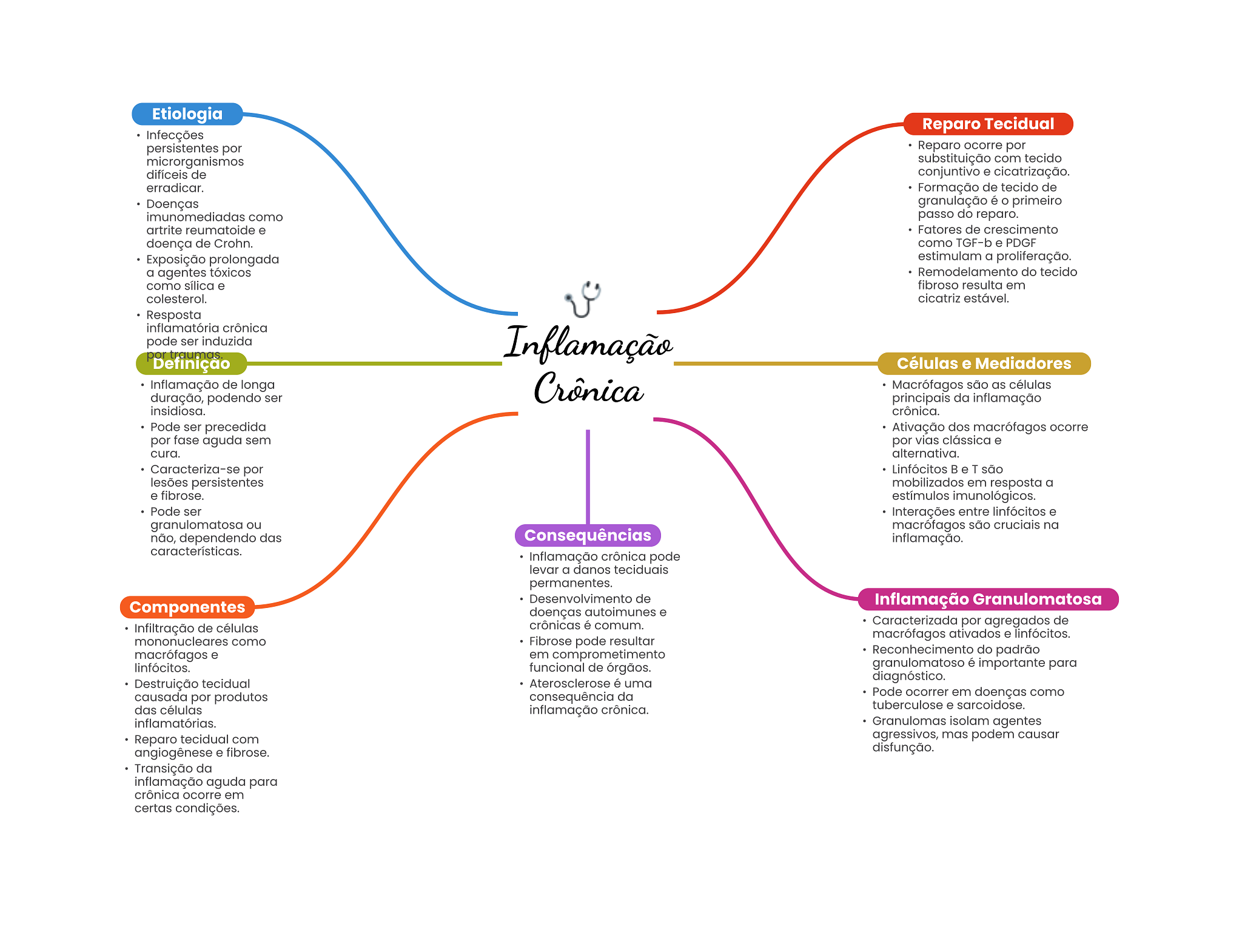 Etiologia Reparo Tecidual Infecções persistentes por Reparo ocorre por microrganismos substituição com tecido difíceis de conjuntivo e cicatrização. erradicar. Formação de tecido de Doenças granulação é primeiro imunomediadas como passo do reparo. artrite reumatoide e Fatores de crescimento doença de Crohn. como TGF-b e PDGF Exposição prolongada estimulam a proliferação. a agentes tóxicos Remodelamento do tecido como sílica e fibroso resulta em colesterol. cicatriz estável. Resposta inflamatória crônica pode ser induzida por Definição traumas Inflamação Células e Mediadores Inflamação de longa duração, podendo ser Crônica Macrófagos são as células principais da inflamação insidiosa. crônica. Pode ser precedida Ativação dos macrófagos ocorre por fase aguda sem por vias clássica e cura. alternativa. Caracteriza-se por Linfócitos e T são lesões persistentes mobilizados em resposta a e fibrose. estímulos imunológicos. Pode ser Interações entre linfócitos e granulomatosa ou macrófagos são cruciais na não, dependendo das Consequências inflamação. características. Inflamação crônica pode levar a danos teciduais permanentes. Desenvolvimento de Componentes Inflamação Granulomatosa doenças autoimunes e Infiltração de células crônicas é comum. Caracterizada por agregados de macrófagos ativados e linfócitos. mononucleares como Fibrose pode resultar macrófagos e em comprometimento Reconhecimento do padrão linfócitos. funcional de órgãos. granulomatoso é importante para Destruição tecidual Aterosclerose é uma diagnóstico. causada por produtos consequência da Pode ocorrer em doenças como das células inflamação crônica. tuberculose e sarcoidose. inflamatórias. Granulomas isolam agentes Reparo tecidual com agressivos, mas podem causar angiogênese e fibrose. disfunção. Transição da inflamação aguda para crônica ocorre em certas condições.